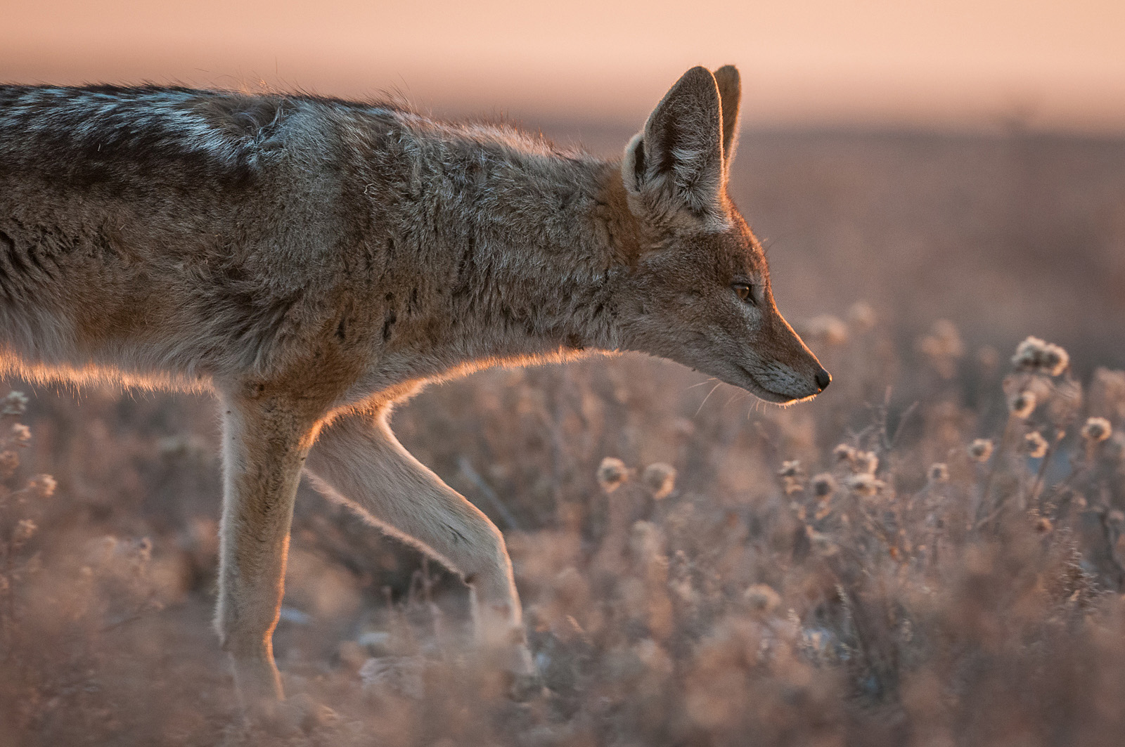 The black-backed jackals of Africa look a lot like our coyotes. They are known as opportunistic omnivores. They hunt smaller mammals, but more often than not, they scavenge the kills of lions and other cats. I photographed this guy as the sun was setting on the Kalahari Desert in Botswana. Nikon D300 with Nikkor 200-400mm lens (at 200mm) ISO 800, f/4 at 1/250th of a second.