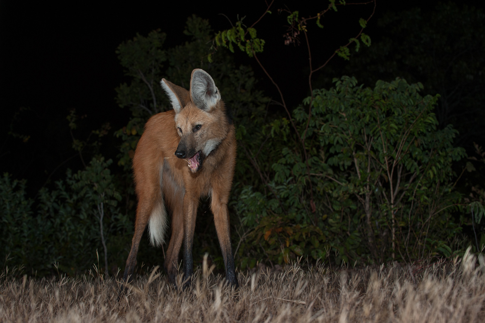 It’s been more than three years since I posted a photo of my encounter with maned wolves in Piaui State, Brazil. Often referred to as a fox on stilts, the mostly-nocturnal maned wolf has exceedingly long legs — an adaptation to the tall grasslands where it spends most of its time. Nikon D700 with Nikkor 70-200mm lens (at 78mm) ISO 200, f/7.1 at 1//60th of a second, two Nikon SB-800 flash units.