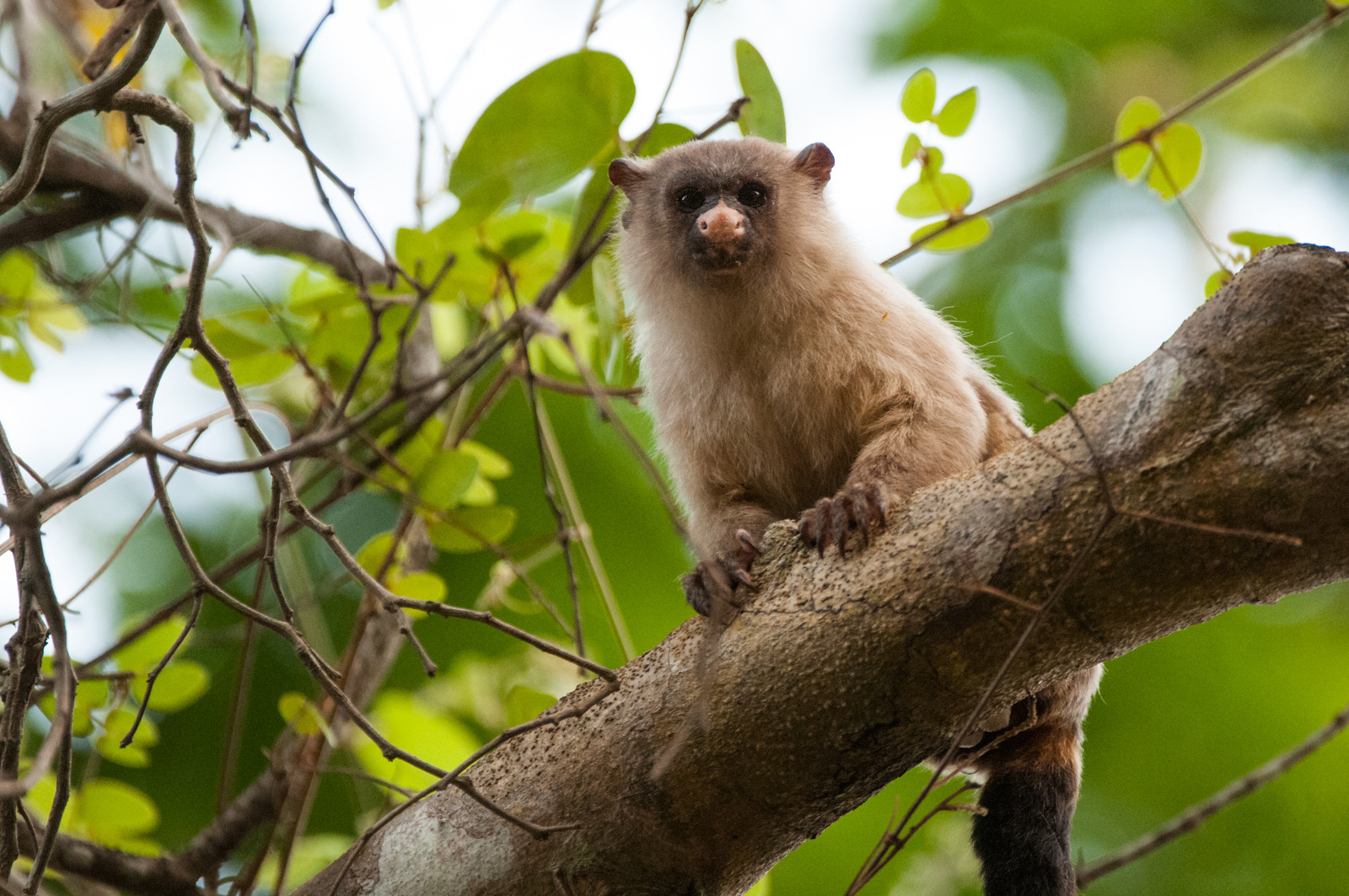 Marmosets are very small monkeys. Most of the 22 different species are only about eight inches long (not including the tail). They are also fairly primitive with a less developed brain than other monkeys and several interesting physical characteristics like claws rather than nails. This black-tailed marmoset was photographed in the Pantanal of Brazil. Nikon D300 with Nikkor 200-400mm lens (at 400mm) ISO 1600, f/4 at 1/1000th of a second.