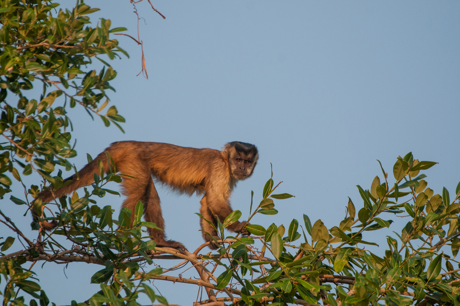 The tufted capuchin’s of the Hyacinth Valley in Brazil are very smart monkeys. Thus the nickname. They’ve learned how to harvest pine nuts and then use tools to open them. They start by tearing the outer husks off the nuts and then leave them in the sun to dry for about a week. When they return to the dried nuts, they place them on a large flat rock surface, which acts as an anvil. They then use much harder igneous rock boulders as their tools to smash open the nuts. Only chimpanzees are known to make more intelligent use of tools. I’ve posted a few shots in the past of the action with the rocks. This guy was simply posing for the camera against that nice blue sky. Nikon D300 with Nikkor 200-400mm lens (at 490mm with 1.4 teleconverter) ISO 400, f/5.6 at 1/1250th of a second.