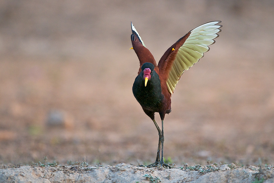 Jacanas are odd birds to begin with. For one, they have enormous feet which enable them to walk on floating vegetation, like lily pads, without sinking. The females of the species are polyandrous — meaning they will take two or more (usually 4) mates at the same time. The males will incubate the eggs, while the females defend their various nests. But perhaps the most curious thing about certain jacanas, including this wattled jacana from Brazil, are the wing spurs. It remains uncertain as to what exactly the purpose of the spurs is. Nikon D300 with Nikkor 200-400mm lens (at 380mm) ISO 800, f/4 at 1/800th of a second