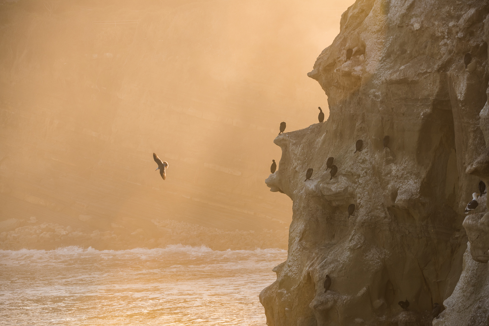 Following a work trip to San Diego back in January, I tacked on a few days and headed north to La Jolla in search of the “Potholes” at Hospitals Reef. On the way, I caught this morning glimpse of Brandt’s cormorants nesting on a cliff while a Western gull flew past. (Nikon D810 with Nikkor 17-35mm lens (at 17mm) ISO 400, f/11 at 1/100th of a second.)