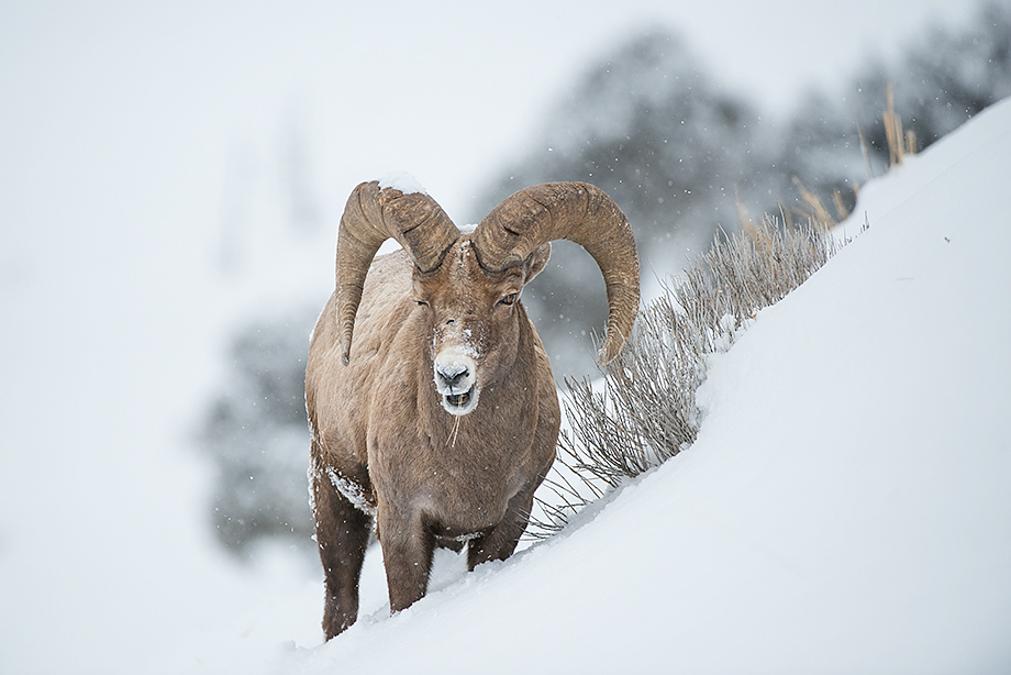Things started a bit slow in Yellowstone back in February. I’ve been to Yellowstone many times, still hoping for better looks at wolves. It didn’t happen this time, but I did have some great opportunities with bighorn, pronghorn, bison and all the other usual suspects. This ram was working hard to find grass beneath the thick bed of snow.