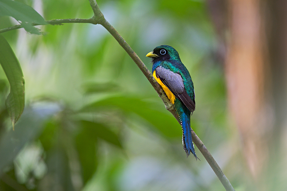 Trogons are among my favorite birds. I’ve had the pleasure of photographing four or five different species in various locations in Central and South America. This is a male black-throated trogon, the local species in Corcovado National Park in Costa Rica. I saw quite a few males as well as the slightly less colorful females. Both of these photos are the same bird. We saw him two days in a row peeking out of that tree cavity — sitting on a couple of eggs. I was also able to get him out of the tree in all his colorful glory.