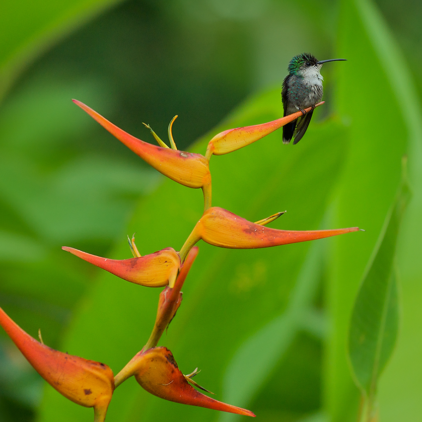 I’m not sure of the exact species on this hummingbird, but it’s just one of the many that I saw at the Tiskita Lodge in Pavones, Costa Rica. The flower the hummingbird is perched upon, however, is clearly a species of heliconia.