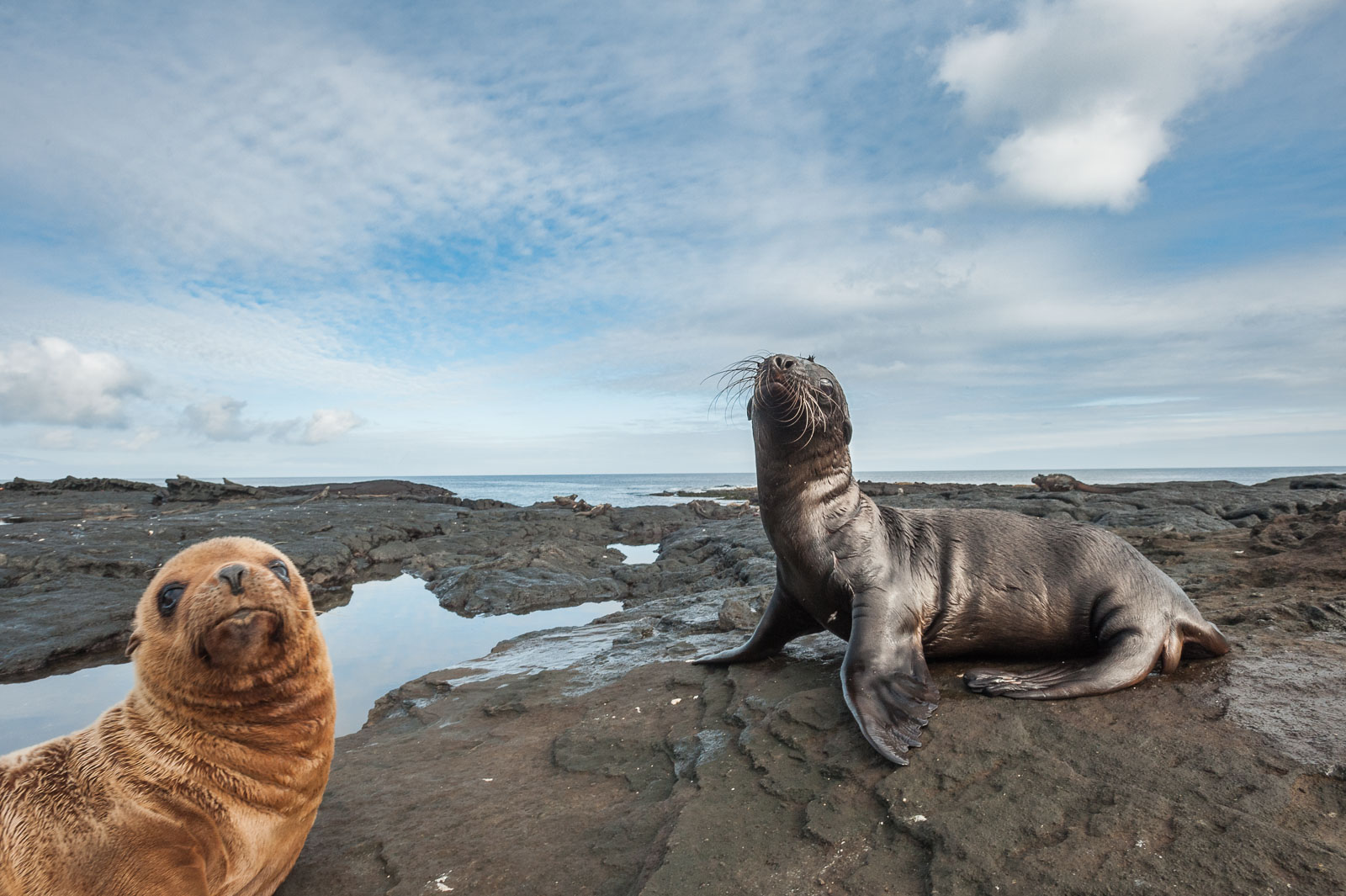 A couple of young Galápagos sea lions pose for the camera. This one was taken on Santiago Island. You can see a bunch of marine iguanas hanging out in the background. In fact, it seems wherever you go in the Galápagos there are marine iguanas hanging out in the background. Nikon D700 with Nikkor 17-35mm lens (at 17mm) ISO 800, f/18 at 1/200th of a second.