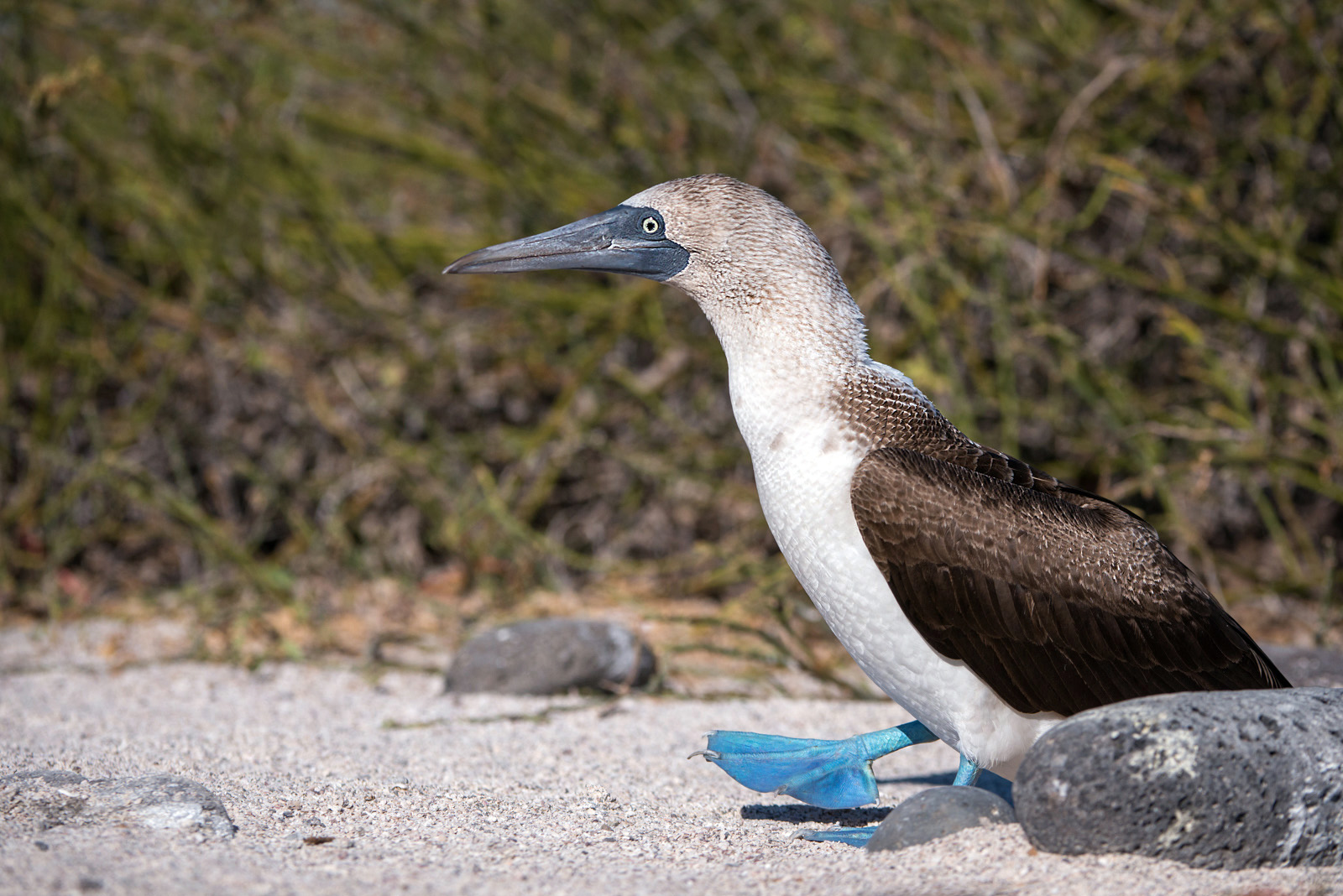 A blue-footed booby showing those characteristic blue feet as it struts across the sand. These guys are one of the iconic species of the Galapagos. I photographed them on several of the islands, including this one on Seymour Island. Nikon D800 with Nikkor 200-400mm lens (at 220mm) ISO 400, f/5 at 1/5000th of a second.