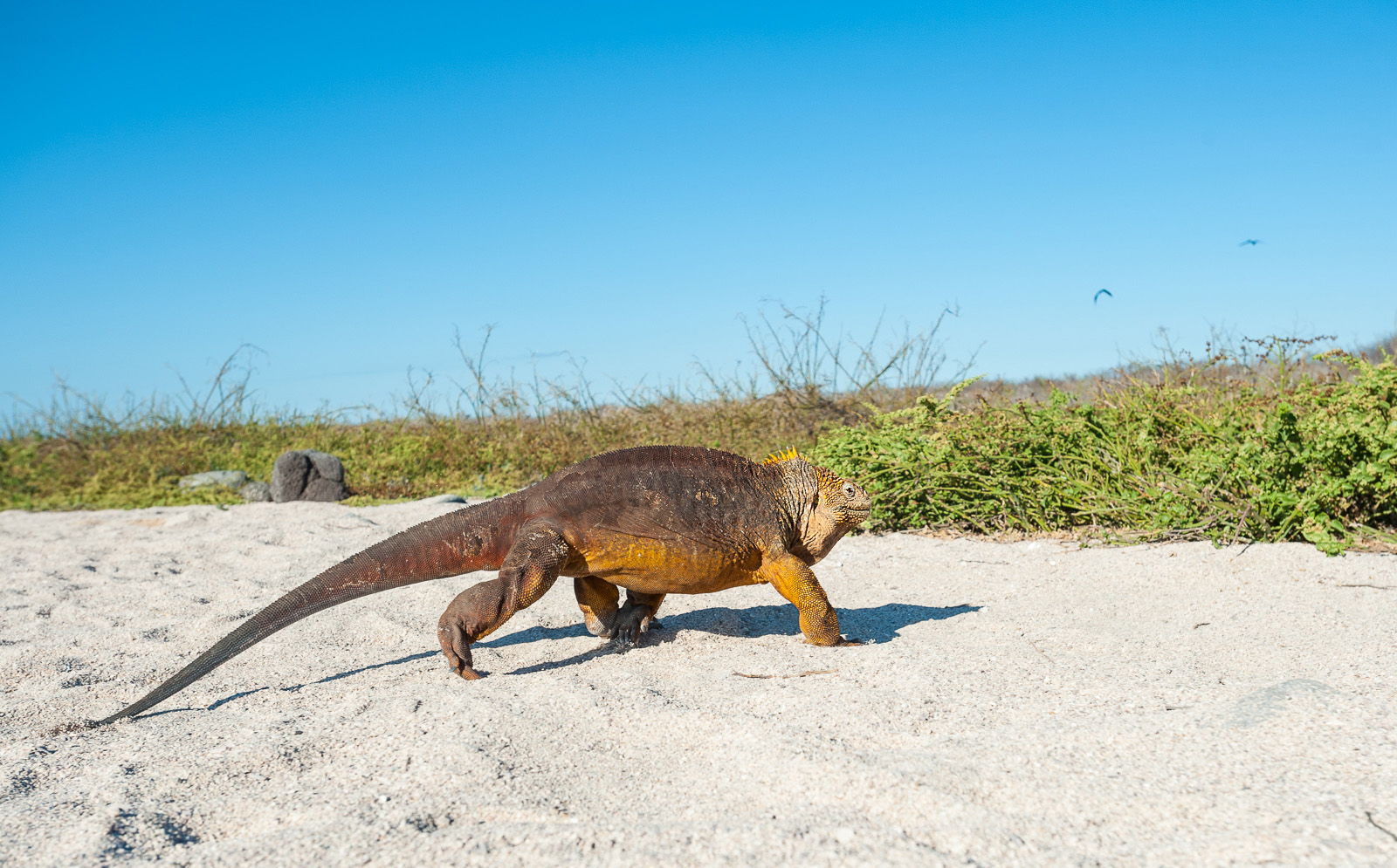 A Galápagos land iguana makes its way across the sandy terrain of North Seymour Island. These guys are big iguanas, usually yellowish/orange in color but they can also be a variety of other colors. Charles Darwin was not impressed as he described them as “ugly animals, of a yellowish orange beneath, and of a brownish-red colour above: from their low facial angle they have a singularly stupid appearance.” Rather unprofessional if I do say so from Mr. Darwin. Nikon D700 with Nikkor 17-35mm lens (at 35mm) ISO 400, f/8 at 1/1250th of a second.