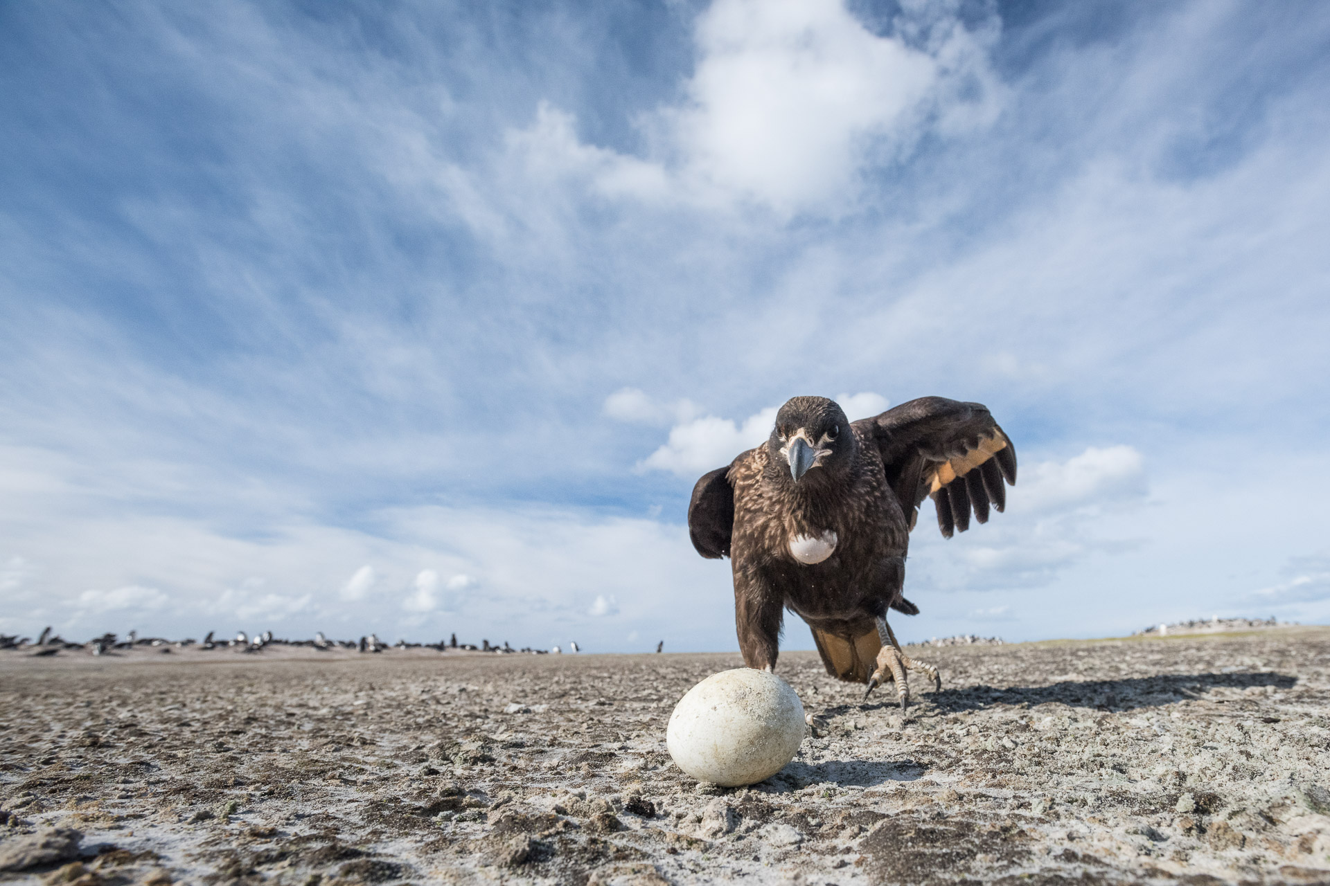 Here’s another look at the striated caracara (aka Johnny Rook). I was down on the ground with my camera and wide angle lens while this guy was chasing around a Gentoo penguin egg, unable to figure out how to break it open as it rolled across the beach on Saunders Island in the Falkland Islands.