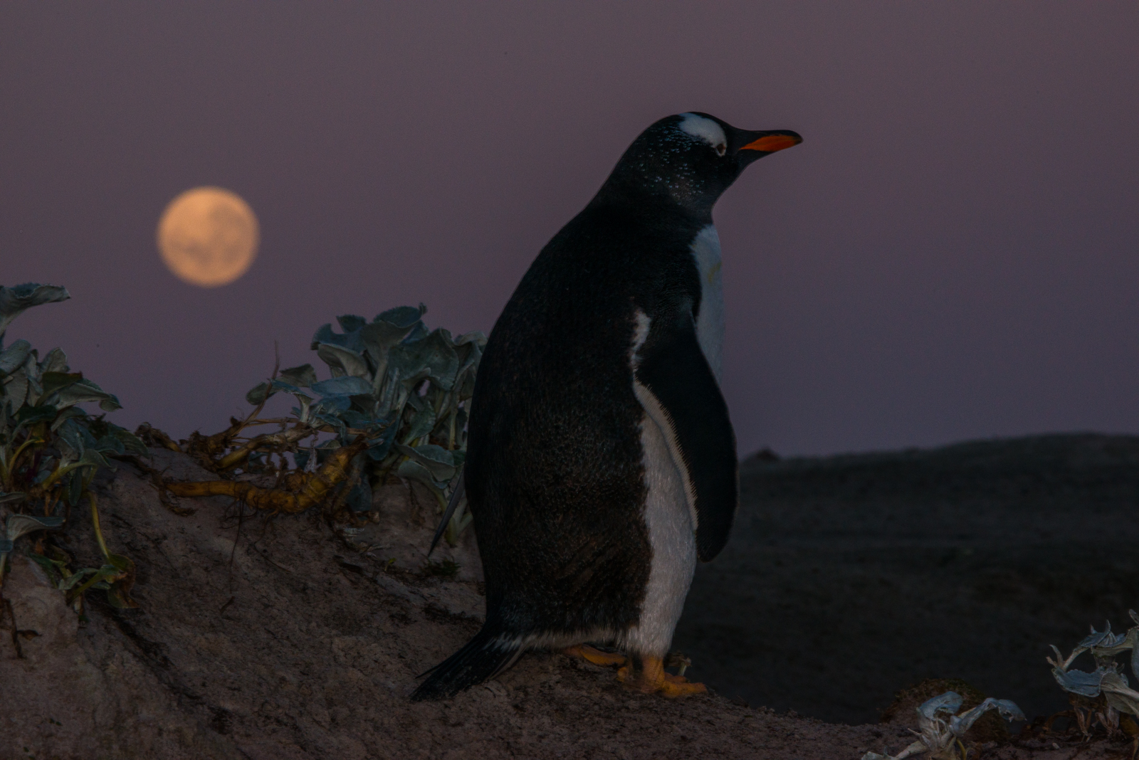 I photographed this gentoo penguin first thing in the morning. By using a longer focal length, I was able to compress the space between the penguin and the moon. A small aperture gave the image more of a night time look than early morning.