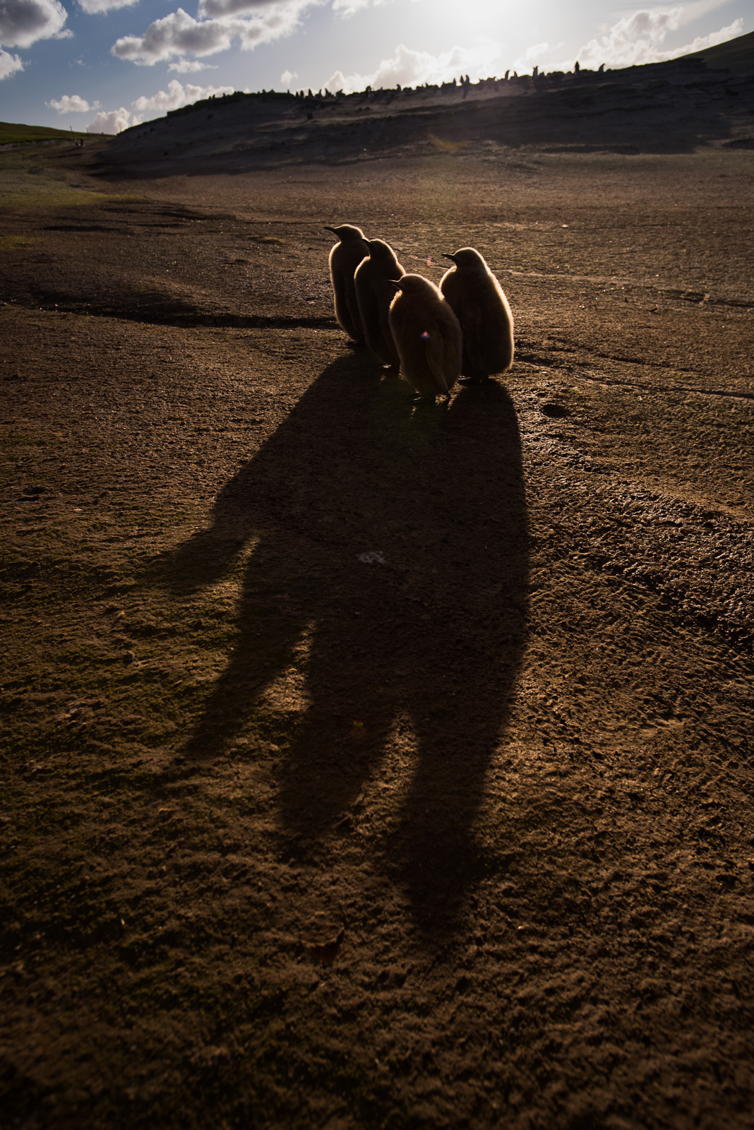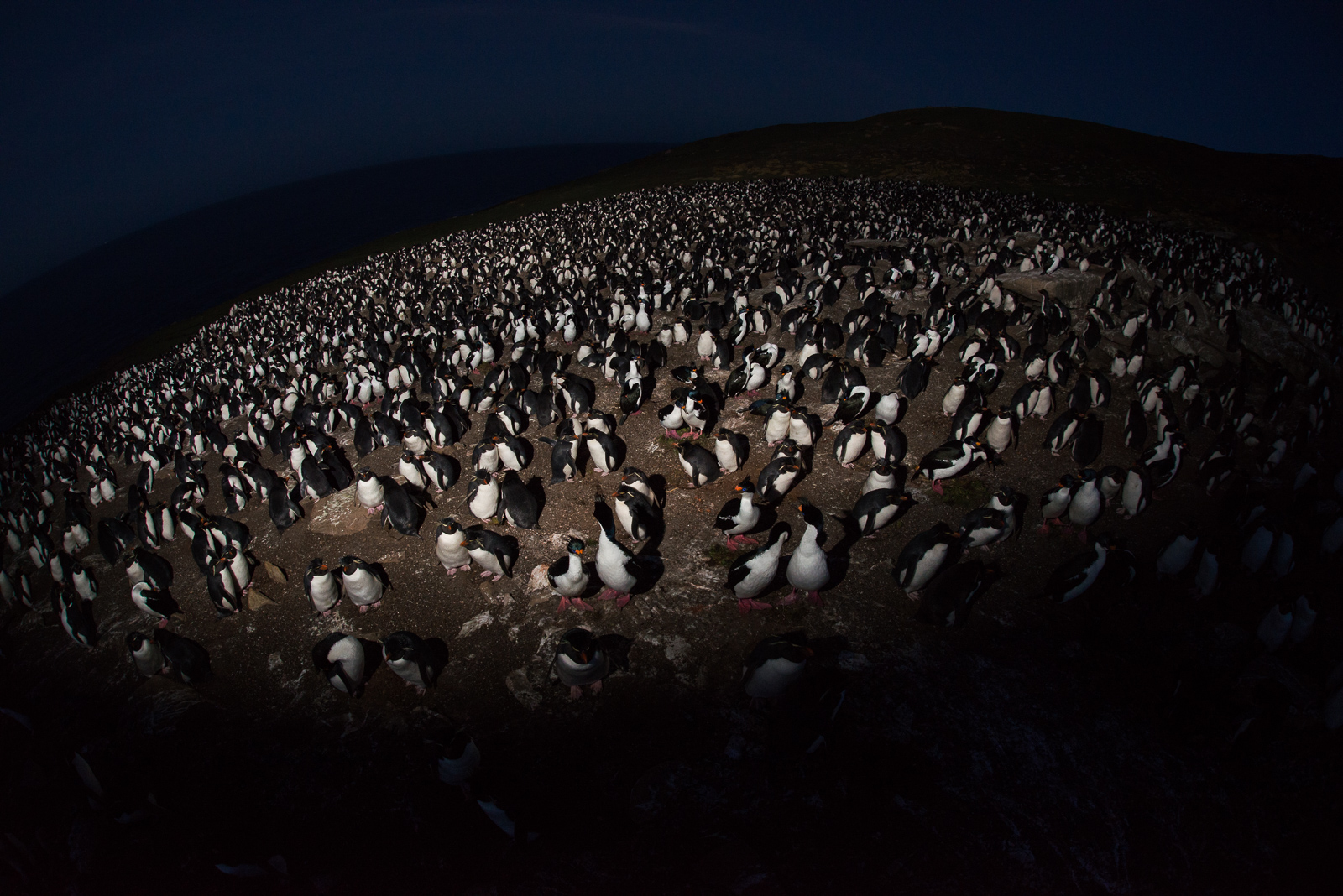 Using a fisheye lens held over my head, plus an off camera flash, I was able to create this spotlit view of a mixed colony of rockhopper penguins and imperial shags. The colony was still quite active just after the sun had gone down on Saunders Island in the Falkland Island, with both species jockeying for position before settling down for the night. The combination of lens, flash and exposure were used to create somewhat of a planetary view of the colony.