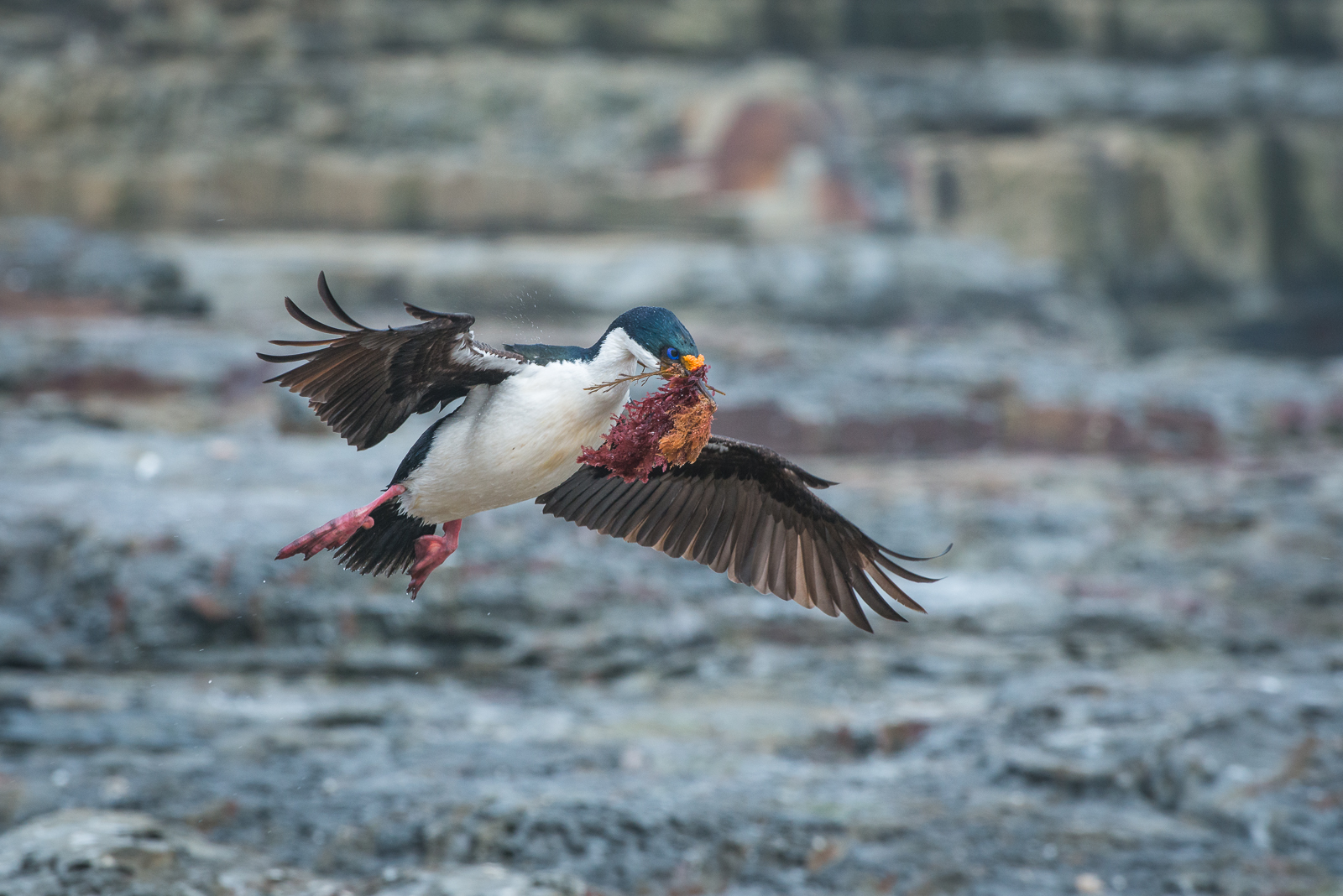 I spent a great afternoon with these imperial shags, also known as imperial cormorants, on the southern tip of Sea Lion Island, which is itself one of the most southerly islands of the Falkland Islands. I had hiked the length of the small island when I came across the colony and it really felt like I had reached the end of the earth. The shags were in the process of nest building and were flying out to sea to collect kelp before returning to their nests. They looked like they had colorful red and orange beards as they came back with beaks full of kelp.