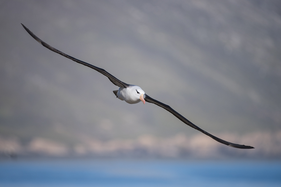 Of the 22 different species, the black browed albatross is considered medium sized by albatross standards. The largest albatrosses have a wingspan of 11 feet. The black browed variety only gets to about 8 feet. Still, that’s a pretty impressive spread. This particular bird seemed to be at least that as it soared along the cliffs of Saunders Island in the Falkland Islands. Nikon D810 with Nikkor 200-400mm lens (at 400mm) ISO 400, f/4 at 1/4000th of a second