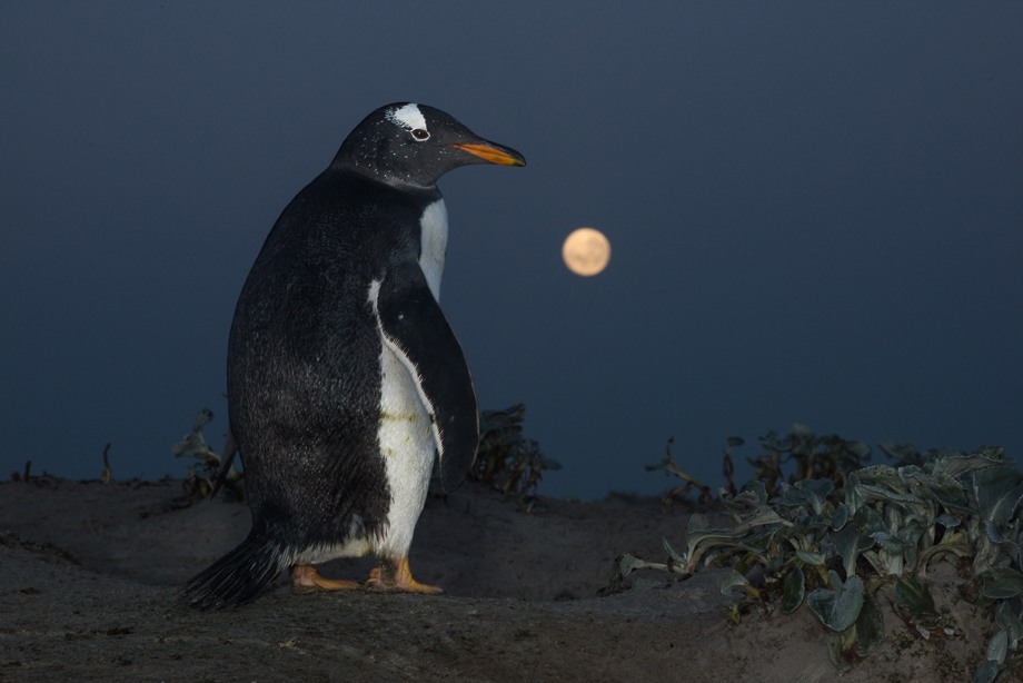 On my last day in the Falkland Islands, I got up before the sun to photograph the penguins with the full moon. The gentoos and the kings both get up early and head down to the shoreline. This gentoo was at the top of the dunes, just before waddling down to the water. Nikon D810 with Nikkor 70-200mm lens (at 160mm) ISO 400, f/22 at 1/25th of a second, two Nikon SB-900 flash units fired using Pocket Wizard controllers