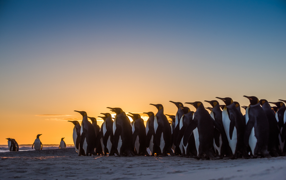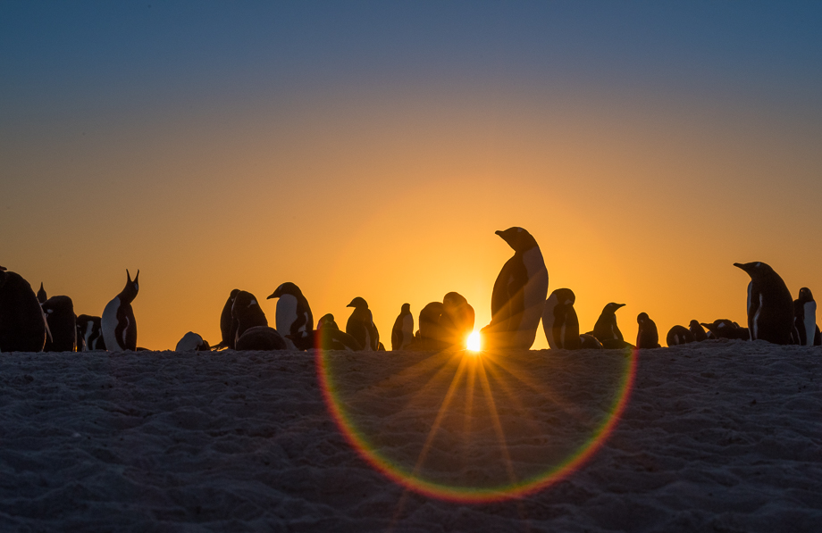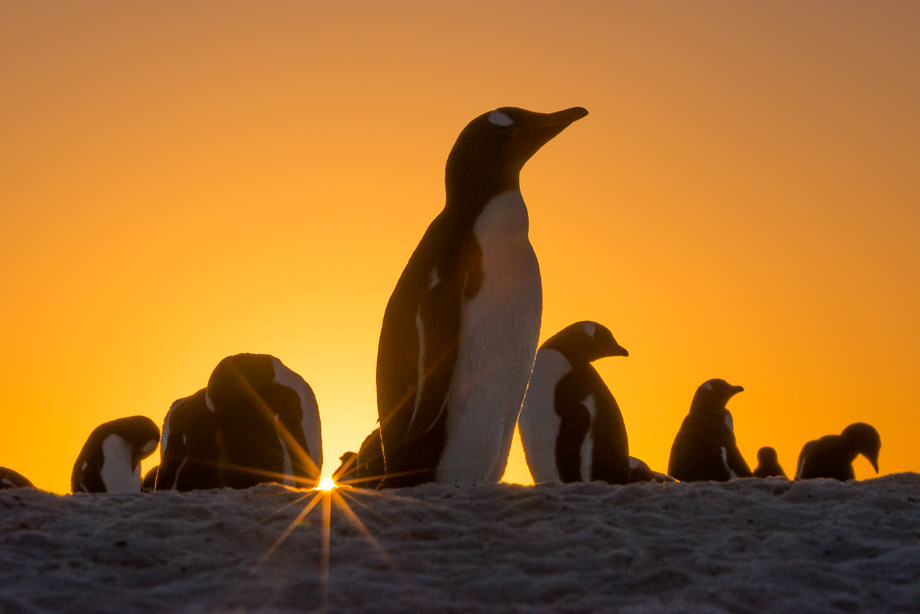 Here’s another in my gentoo sunburst series that I took on Sea Lion Island in the Falklands. These gentoo penguins had just come in from their afternoon swim and were taking a break at the top of the beach just as the sun was setting. I was able to get low to record the sun as a starburst on the horizon. I dialed in enough exposure compensation so that there was some detail in the penguins and it wasn’t a complete silhouette. A tiny aperture helped with the sunburst effect. Nikon D800 with Nikkor 200-400mm lens at 220mm, f/32 at 1/400th of a second