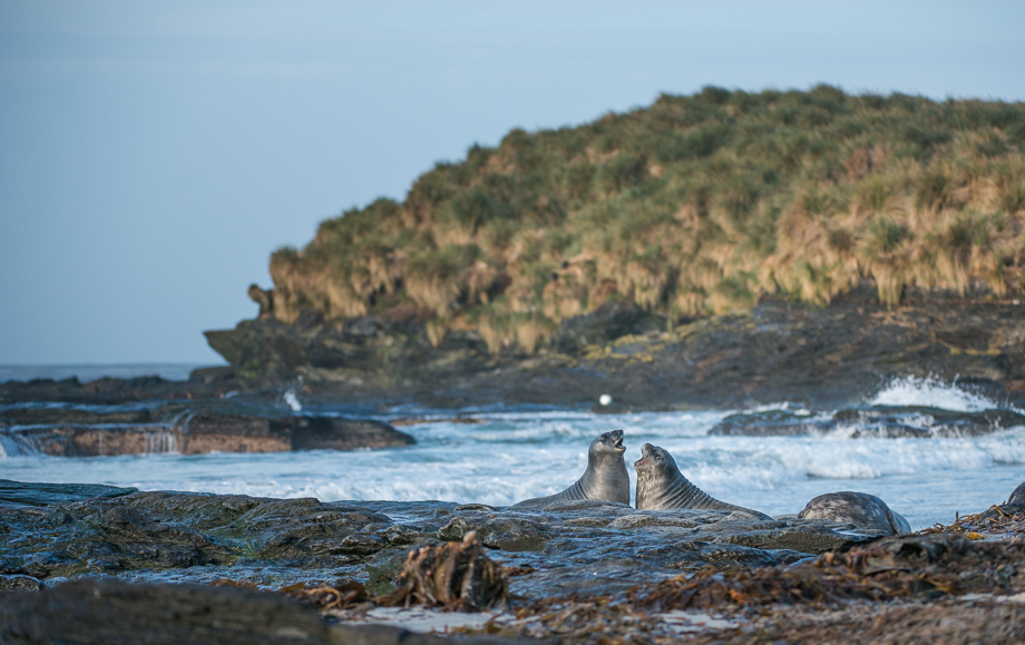 Tussock grass fringes many of the islands in the Falklands. You can see it here in the background behind these two young elephant seals. It can grow to well over six feet tall. Walking through clumps of it can be like walking through a maze — and you never know where a 20 foot long, 9000 pound elephant seal might be hiding. The two seals pictured here are adolescents that were play fighting at low tide on Sea Lion Island. Nikon D800 with Nikkor 200-400mm lens (at 200mm) ISO 800, f/4 at 1/2500th of a second