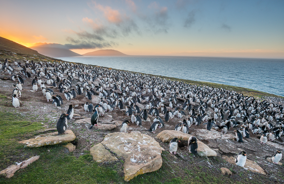 The sun rises in the Falklands as the activity at a rockhopper penguin colony kicks into high gear. Another day of hopping up and down rocks, swimming, fishing, building nests, eating, mating, squabbling with neighbors and doing all sorts of other penguin-y things. Nikon D800 with Nikkor 17-35mm lens (at 17mm) ISO 200, f/18 at 1/30th of a second