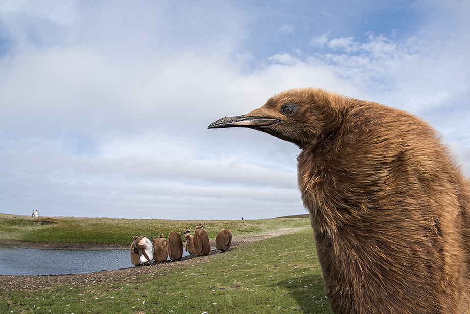 The only baby penguins that I saw were the kings (all the others start hatching in December). The kings hatch at that time too, but they take much longer to develop so I was seeing second year chicks. This is just before they begin to molt and lose all those brown furry looking feathers on their way to becoming adults. They hang out in groups known as creches while the adults are out at sea for months at a time. Much more on these guys in the coming weeks. Nikon D810 with Sigma 15mm fisheye lens, ISO 400, f/10 at 1/640th of a second
