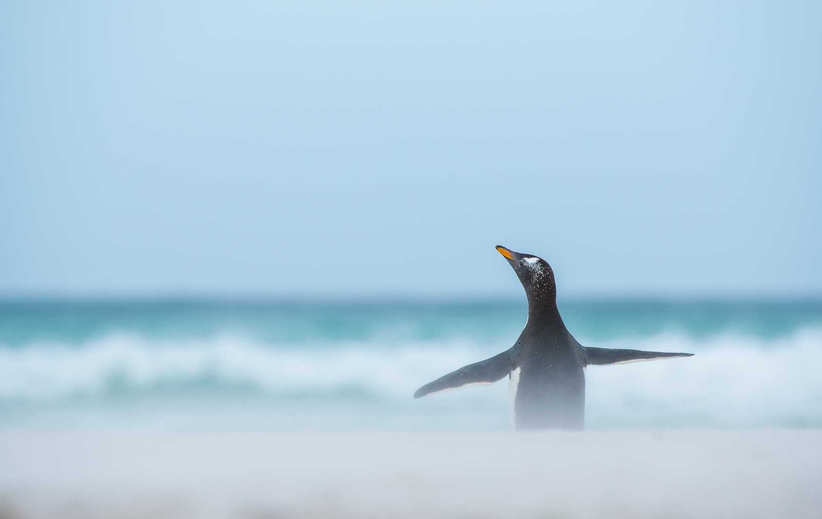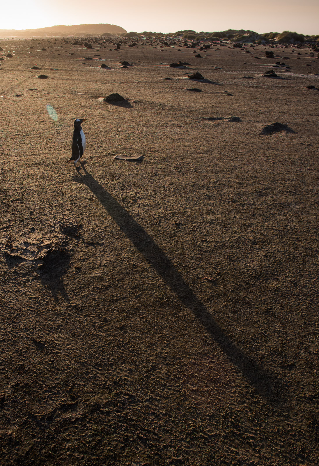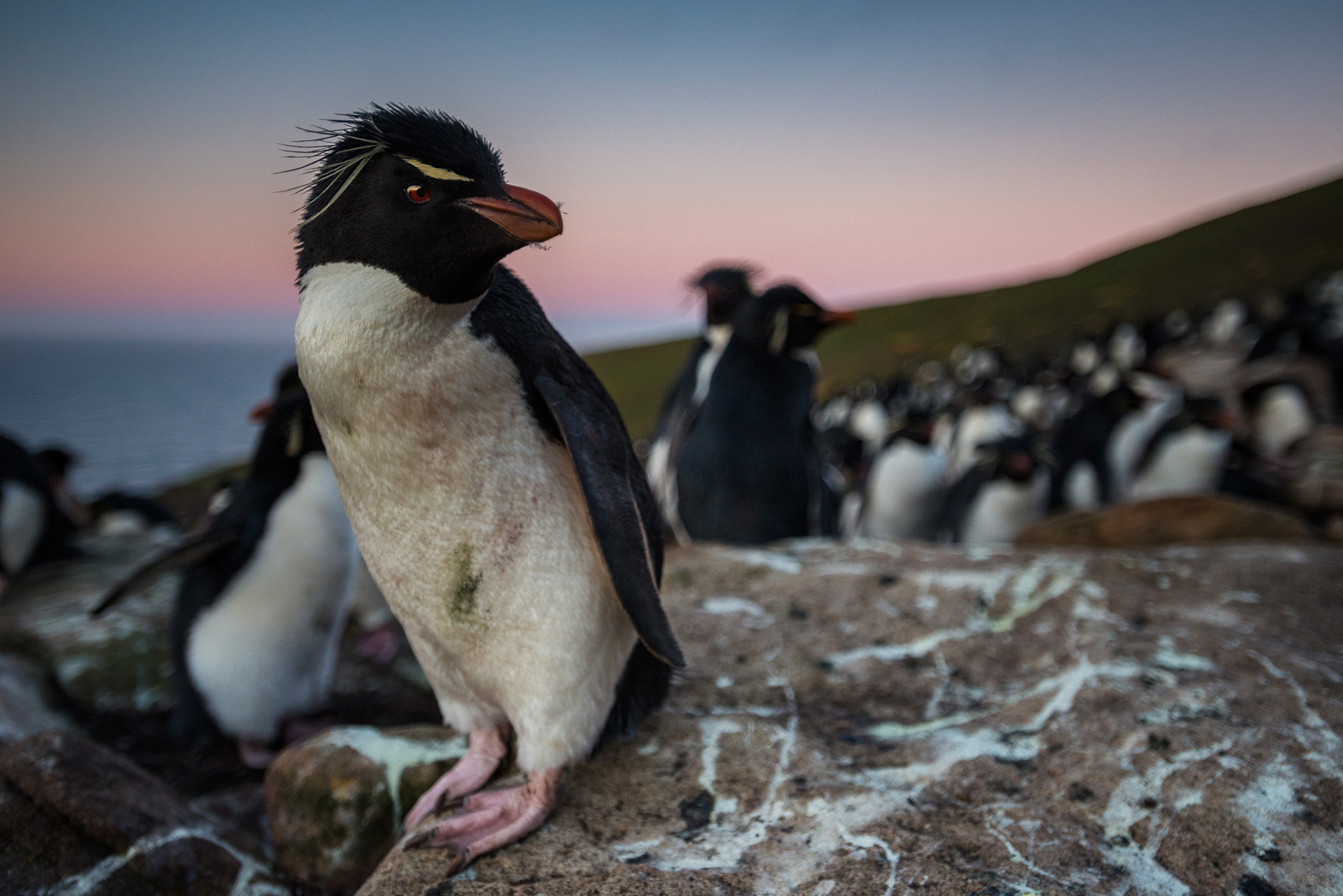 A rockhopper penguin stands above the colony as the sun sets over the south Atlantic Ocean on Saunders Island in the Falklands. It was one of the highlights of my wildlife career to spend a few weeks alone with rockhopper, king, gentoo, Magellanic and macaroni penguins — unconcerned with time or having to be anywhere in particular other than right where I was. Nikon D800 with Nikkor 17-35mm lens (at 28mm) ISO 1600, f/2.8 at 1/250th of a second.