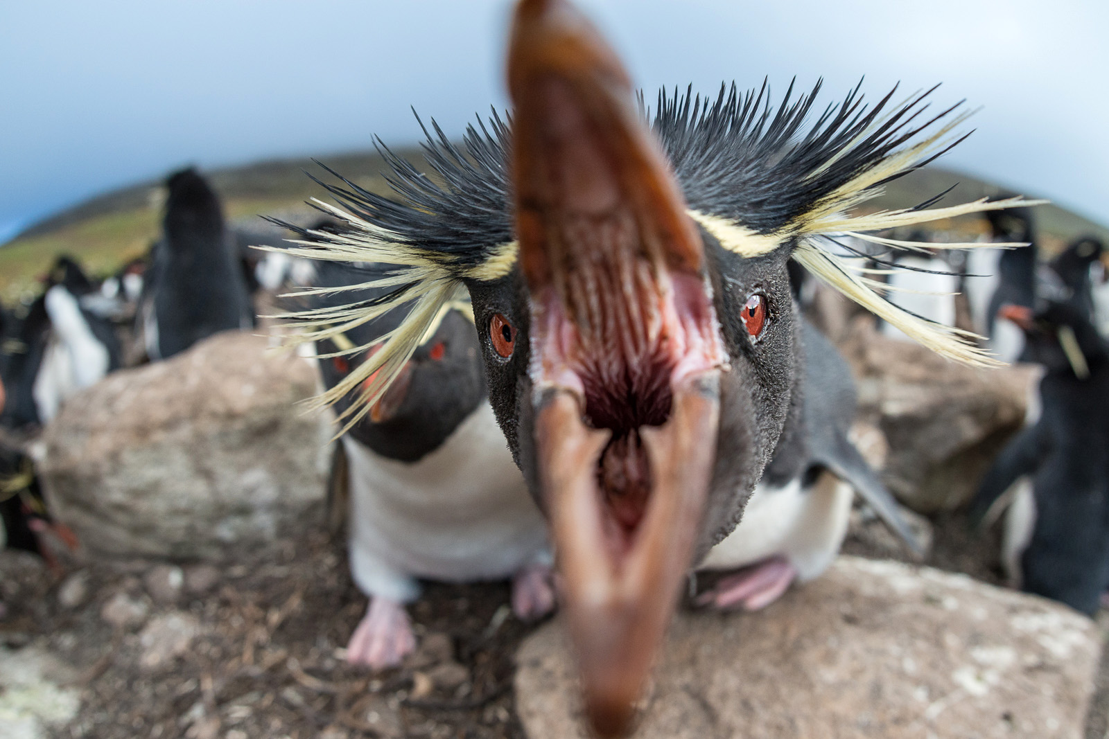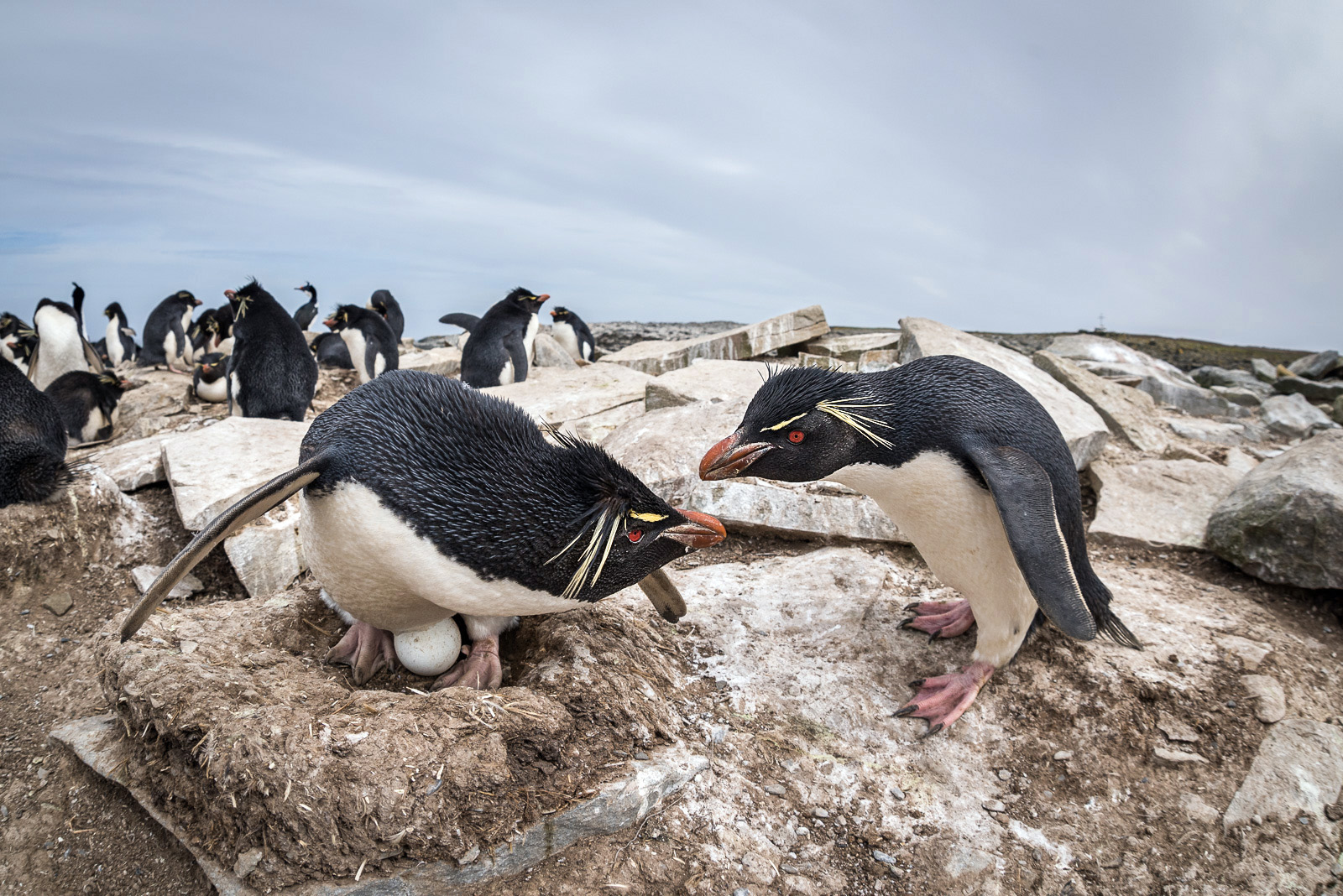My trip to the Falkland Islands coincided with the breeding season for the rockhopper penguins. Both parents tend to the eggs (usually two) for the first week or so, after which the males go out to sea to fish, returning two to four weeks later. In this photo, a breeding pair is still in the shared duty phase, which happens in November. Nikon D810 with Sigma 15mm fisheye lens, ISO 400, f/8 at 1/1250th of a second.