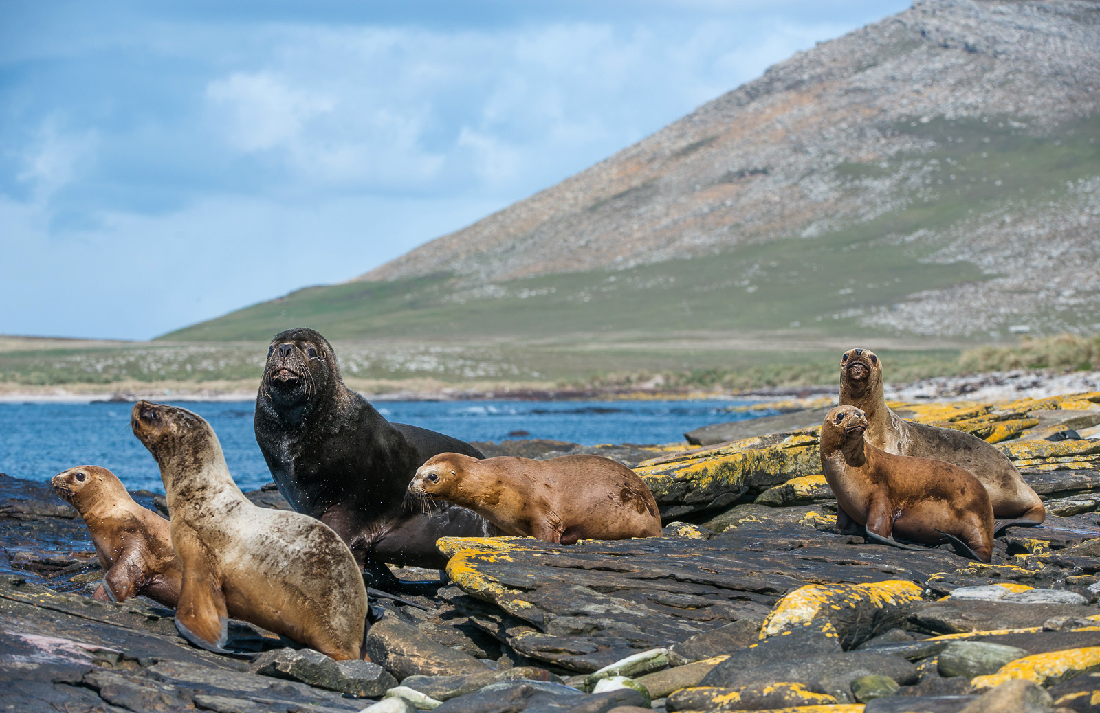 A family of southern sea lions head toward the water on Carcass Island in the Falkland Islands. These guys are also called the South American sea lion and the Patagonian sea lion. On the west coast of South America, they range from Peru in the north to the southern tip of Chile and the Falkland Islands and then on the east coast on up into southern Brazil. Nikon D800 with Nikkor 200-400mm lens (at 200mm) ISO 400, f/8 at 1/1000th of a second.