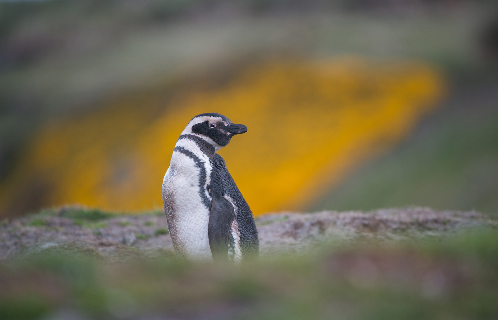 Last week I posted a rockhopper penguin from my trip to the Falkland Islands. Here is a much different member of the order — the Magellanic penguin. Unlike the highly social rockhoppers that live in open colonies, these guys live independently in burrows in the ground. They were much more skittish to my approach. Of course, they don’t have the safety in numbers that the rockhoppers, gentoos and kings do. That yellow patch in the background is from the gorse bush flowers that were blooming all over the hillsides. Nikon D800 with Nikkor 200-400mm lens (at 400mm) ISO 800, f/4 at 1/125th of a second.