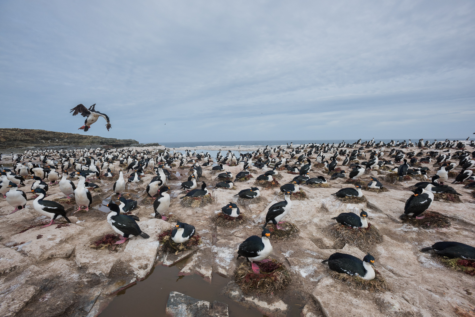 At one of the southernmost points of one of the southernmost islands in the Southern Hemisphere lies this barren spot, taken over as an imperial shag nesting site. The shags, or cormorants, are constantly at work, flying out to sea to collect kelp for their nests. There is also a fair amount of thievery going on. When one shag leaves the nest, neighbors attempt to pilfer the unattended kelp. I had a great afternoon, alone with the shags, watching all the goings on. Photographed on Sea Lion Island in the Falkland Islands. Nikon D810 with Nikkor 17-35mm lens (at 17mm) ISO 400, f/10 at 1/1600th of a second.