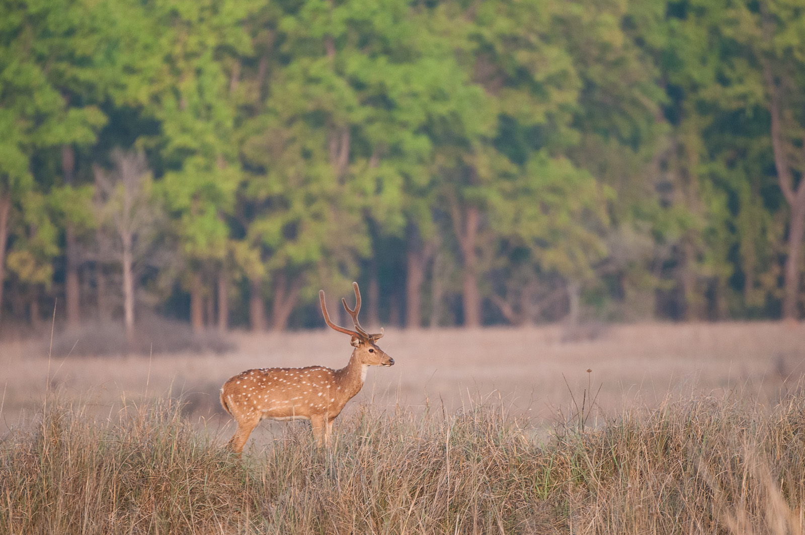 The chital, also known as the spotted deer, is native to the Indian subcontinent. They were quite common in the two national parks that I visited in India and kept me quite occupied while waiting for tigers to show up. They look a bit like our white tailed deer if the young were never to lose their spots. This male chital was posing in the late day light in Kanha National Park. Nikon D300 with Nikkor 200-400mm lens (at 400mm) ISO 800, f/4 at 1/500th of a second.