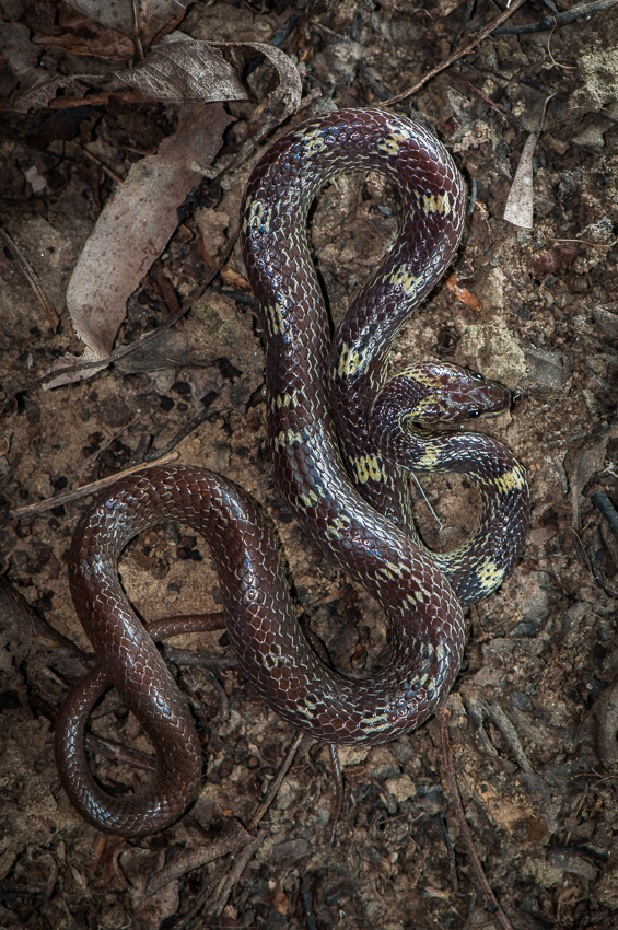 The wolf snake is a very small snake that lives in India and other areas of southeast Asia. It is primarily nocturnal, and I found this one near our camp, shortly after eating dinner one night in India’s Kanha National Park. It is a non-venomous snake, but will bite if threatened. It gets its name from a set of rather large front teeth that resemble those of a canine. It uses those teeth to prey on lizards, frogs, geckos and other local delicacies. Being so small, I was able to photograph this wolf snake from directly overhead using my 105mm macro lens and a couple of flash units. Nikon D300 with Nikkor 105mm lens, ISO 500, f/8 at 1/60th of a second, two Nikon SB-900 flash units on a RRS bracket