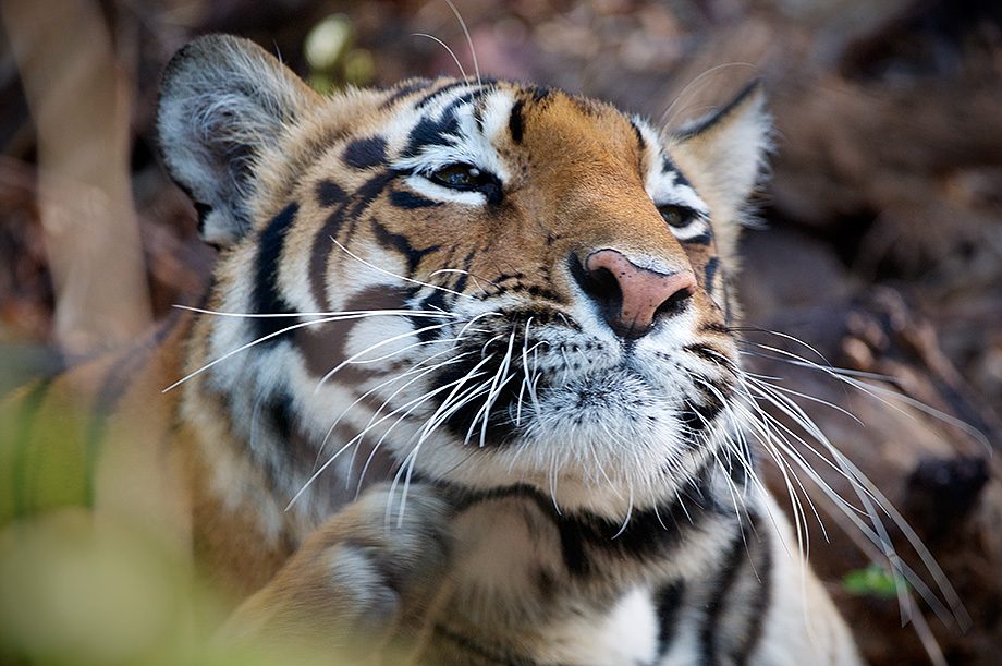 This was the third tiger that I saw in India. Unlike the first two that I viewed from an open air jeep, I had to get on top of an elephant to see this one. She was resting in the shade of some bushes and I couldn’t really get a good look, but then she suddenly lifted up to scratch her chin and I was able to get this shot.