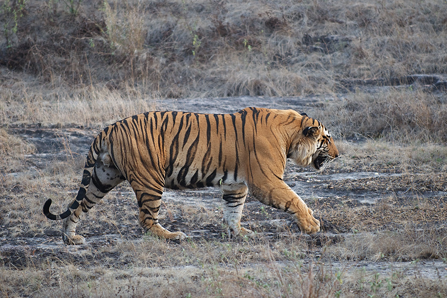 I realize that these two shots aren’t much photographically, but what I wanted to show was just how powerful the male tigers are, and how bulky their upper arms are compared to the females (all the tiger shots that I’ve posted so far have been females). This guy was walking along a ridge and kept his gaze forward, for the most part. In a future post, I’ll upload a more interesting shot of this guy.