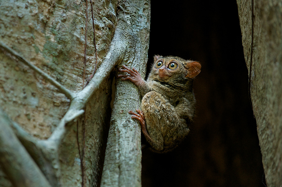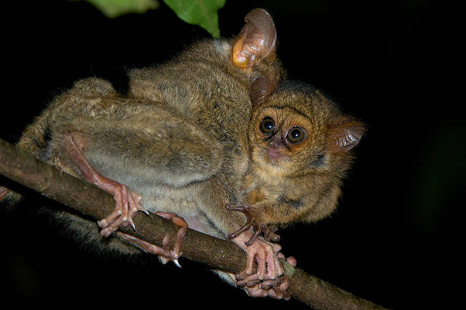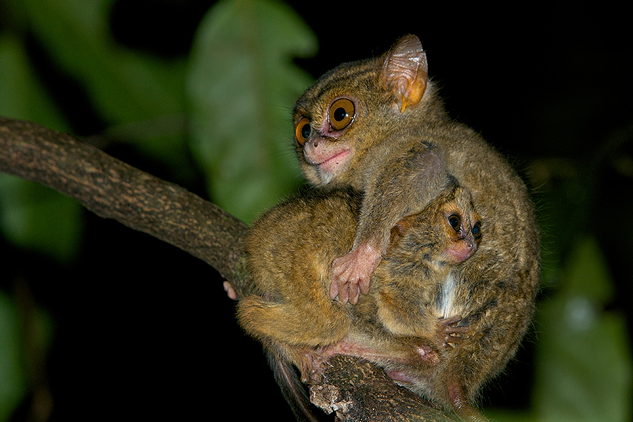 Tarsiers babies aren’t all that much smaller than their parents when they are born. The mother will often carry the baby in her mouth, or tucked under her arm — as is the case in this photo. The mom will find a safe place, leave her baby there, and then go hunting for grasshoppers and other insects.