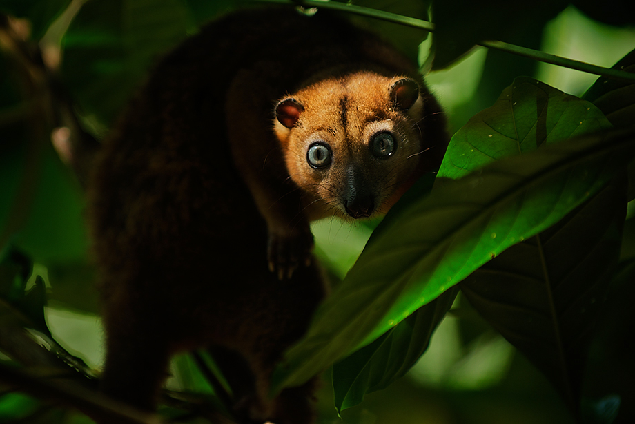 This Sulawesi dwarf cuscus was a challenge to photograph due to the mixed lighting conditions of the deep shadows caused by the thick foliage and the bright highlights caused by the rising sun. For this particular image, I set my camera to expose for the bright areas and waited for the cuscus to pop its head into the light. These guys are pretty rare and only exist on a few islands in Indonesia. I was lucky to see this one. Cuscus are marsupials and are a type of possum. Nikon D700 with Nikkor 70-200mm lens (at 200) ISO 800, f/2.8 at 1/250th of a second