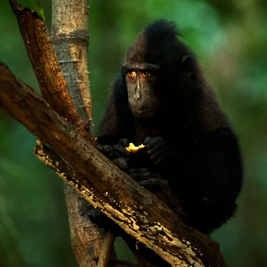 It’s been about a year since I last posted a photo of my favorite primate species, the black-crested macaque. These guys are listed as critically endangered due to the continued loss of their habitat. They live only on the island of Sulawesi in Indonesia. This young macaque was just catching a bit of the late day sun on his face when I snapped the shutter. Nikon D300 with Nikkor 70-200mm lens (at 150mm), f/2.8 at 1/100th of a second (-0.67 ev) ISO 1600