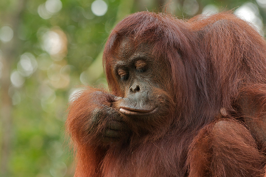 This female orangutan appears to have discovered her lips for the first time. And she seems to like them. Nikon D700 with Nikkor 70-200mm lens (at 190mm) ISO 800, f/5 at 1/200th of a second (- 2/3 stops ev)