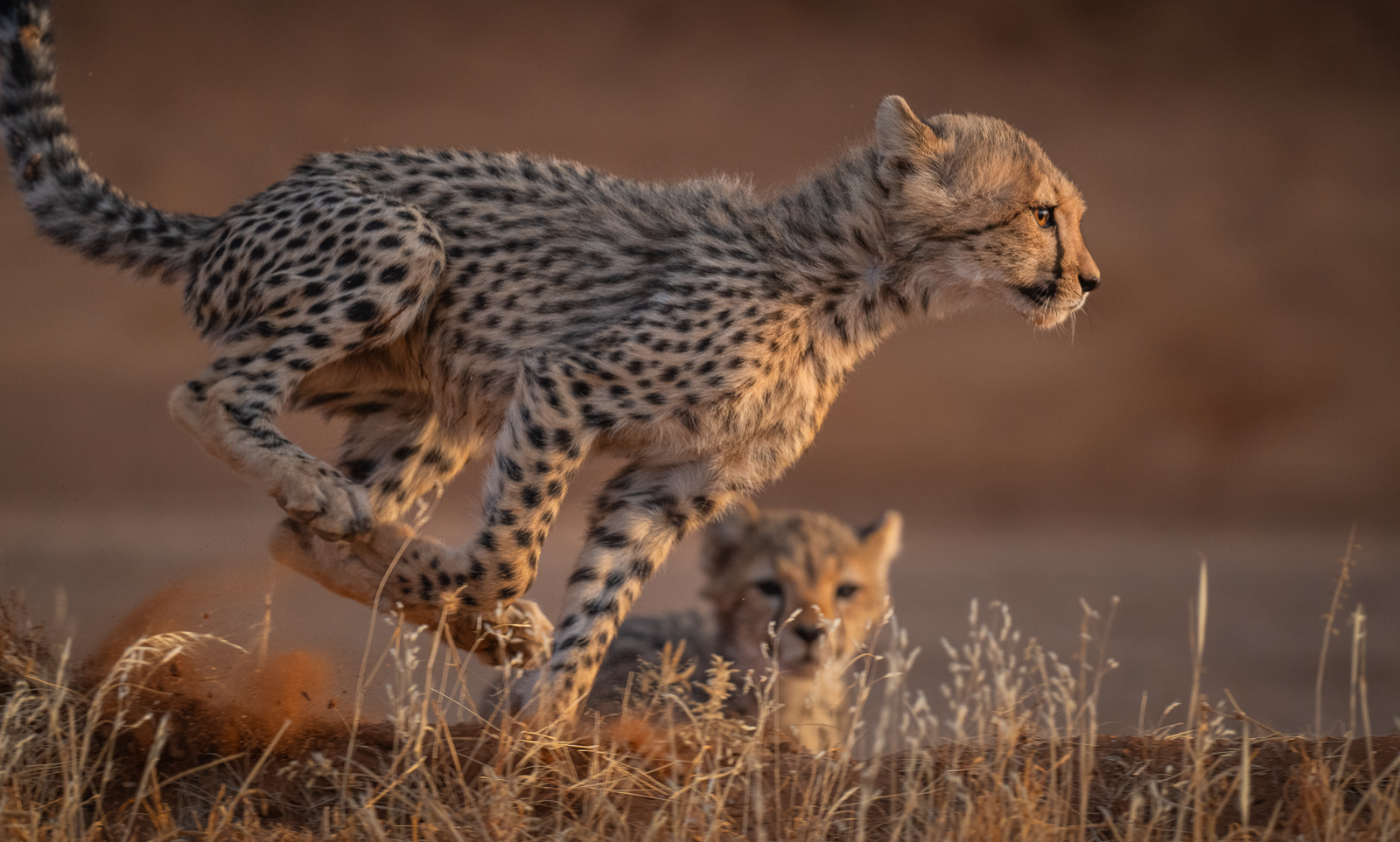 A bat-eared fox pup runs toward the den to play with a sibling — late afternoon in the Masai Mara of Kenya. Nikon D300 with Nikkor 200-400mm (at 400mm) ISO 1600, f/4 at 1/125th of a second.