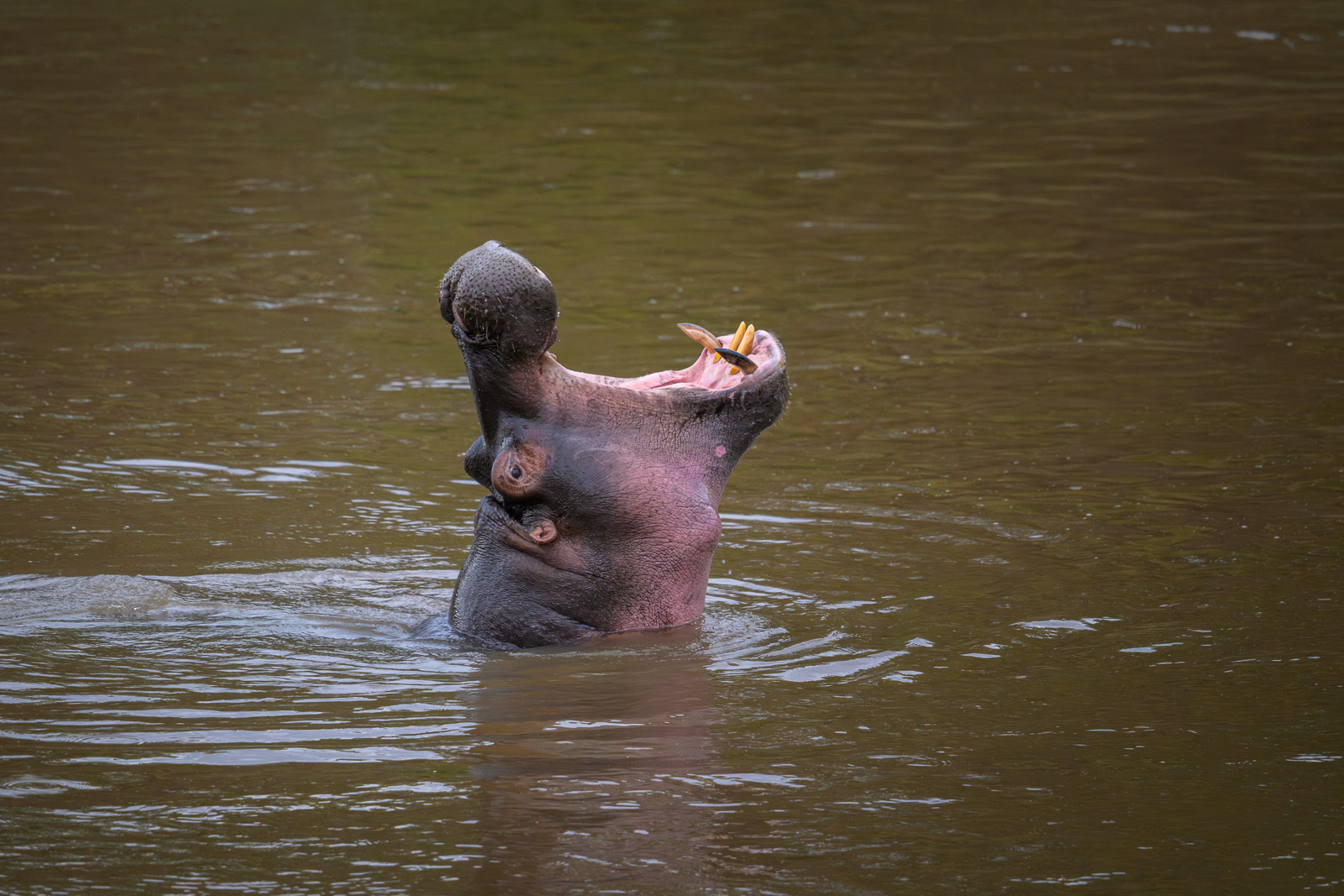 When hippos open their mouths wide and lift their heads skyward, they’re not yawning, they’re showing off in a territorial or dominance display. This dramatic gape, which can stretch over 150 degrees, is meant to intimidate rivals and signal strength without the need for a fight. Males use it especially often to defend their stretch of river or impress females, and the impressive size of their jaws and tusks makes the message loud and clear. Nikon Z8 with Nikkor 500mm PF lens, ISO 4000, f/5.6 at 1/400th of a second.