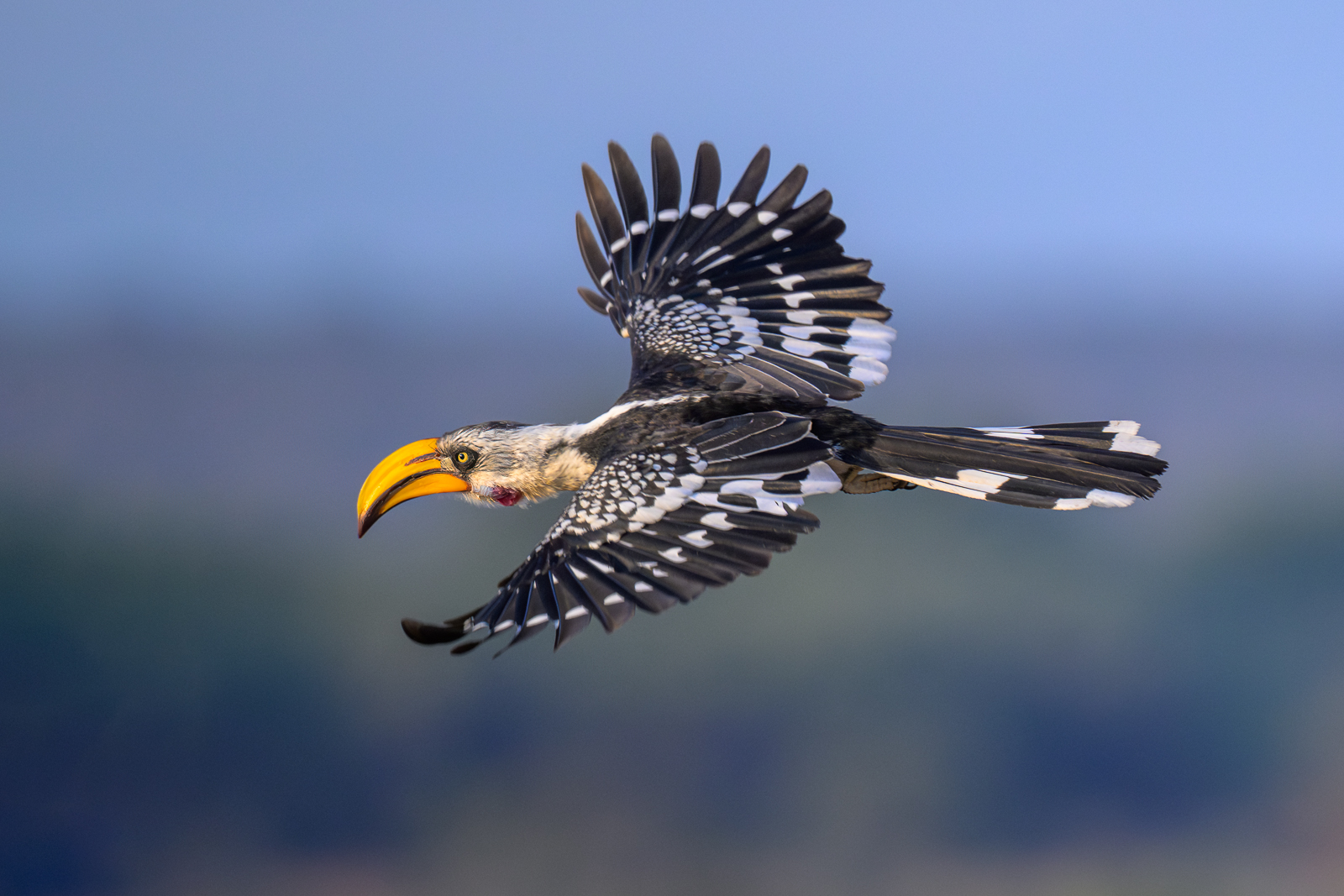 The eastern yellow-billed hornbill is a striking sight in flight, with its broad, rounded wings and long tail feathers fanning out as it moves from tree to tree. Its flight is typically short and swooping, with bursts of flapping followed by glides, giving it a bouncing motion through the air. When it takes off, you can often hear the flap of its wings and catch a flash of its black-and-white plumage and oversized yellow bill cutting through the sky. Nikon Z8 with Nikkor 500mm PF lens, ISO 1250, f/5.6 at 1/2000th of a second.