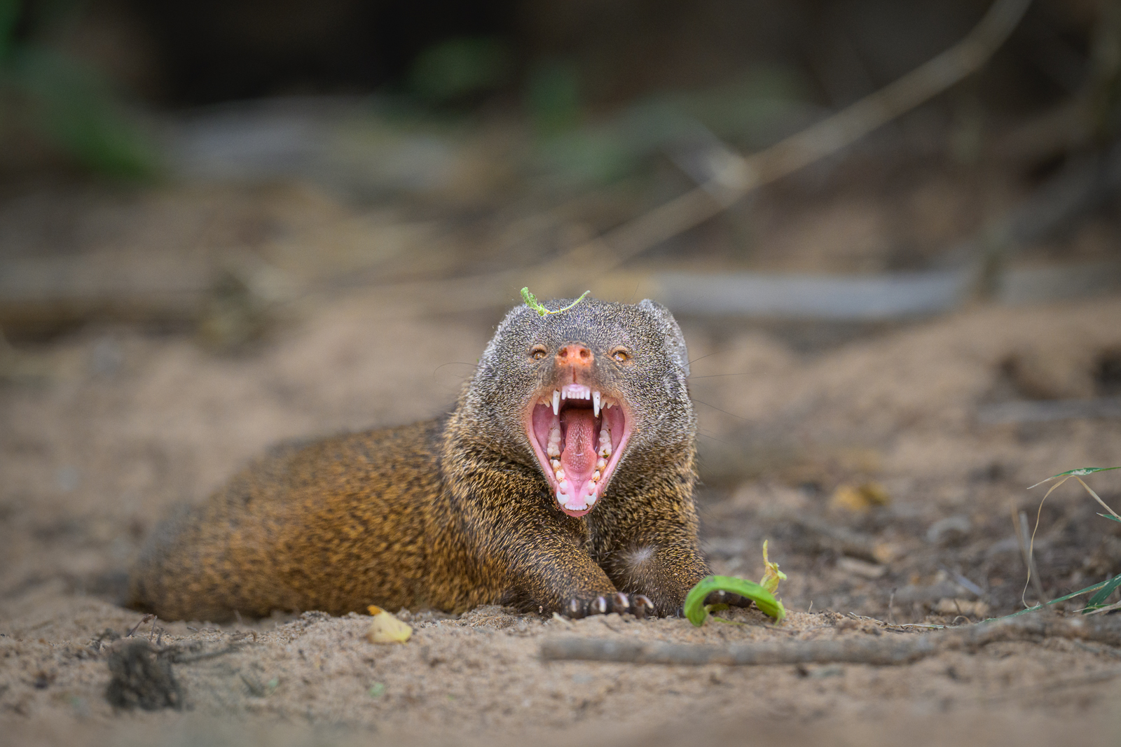 Threat display or simply a yawn? If the former, it’s meant to warn off rivals or predators without physical confrontation. It’s sometimes accompanied by vocalizations or raised fur, which makes the tiny mongoose appear larger and more intimidating. Within the group, it can also be a way to settle dominance disputes or assert rank, part of their highly social and communicative behavior. I should state that even though it looks like she’s looking straight at me, the display started with her looking off to the side at other mongooses before she turned her head toward camera and closed her mouth. Nikon Z8 with Nikkor 500mm PF lens, ISO 2000, f/5.6 at 1/1000th of a second.