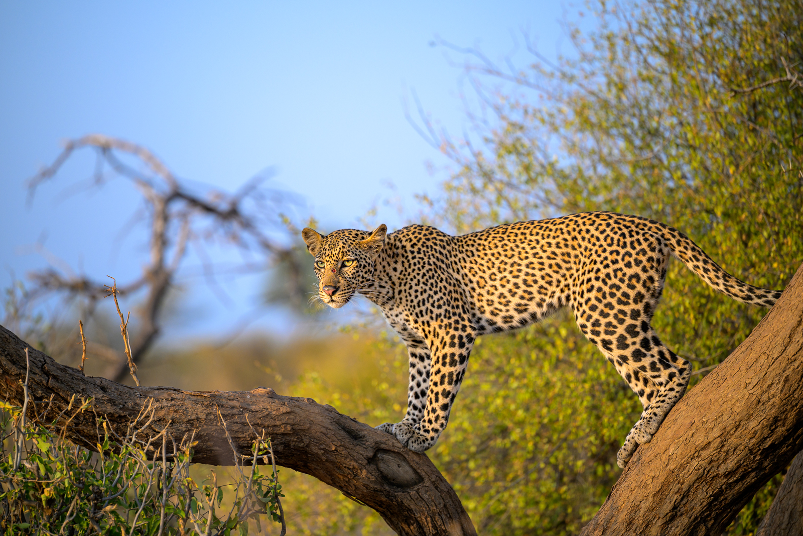 This was the second of the three leopards we saw recently in Kenya. She gave us a nice show as she climbed up and then down a tree before disappearing into the bushes. She must have gotten into some sort of a fight with that little chunk taken out of her nose. We caught up with her again later when she was lounging on a big boulder in the foothills of Samburu National Reserve. Nikon Z8 with Nikkor 70-200mm lens (at 195mm) ISO 200, f/2.8 at 1/1250th of a second.