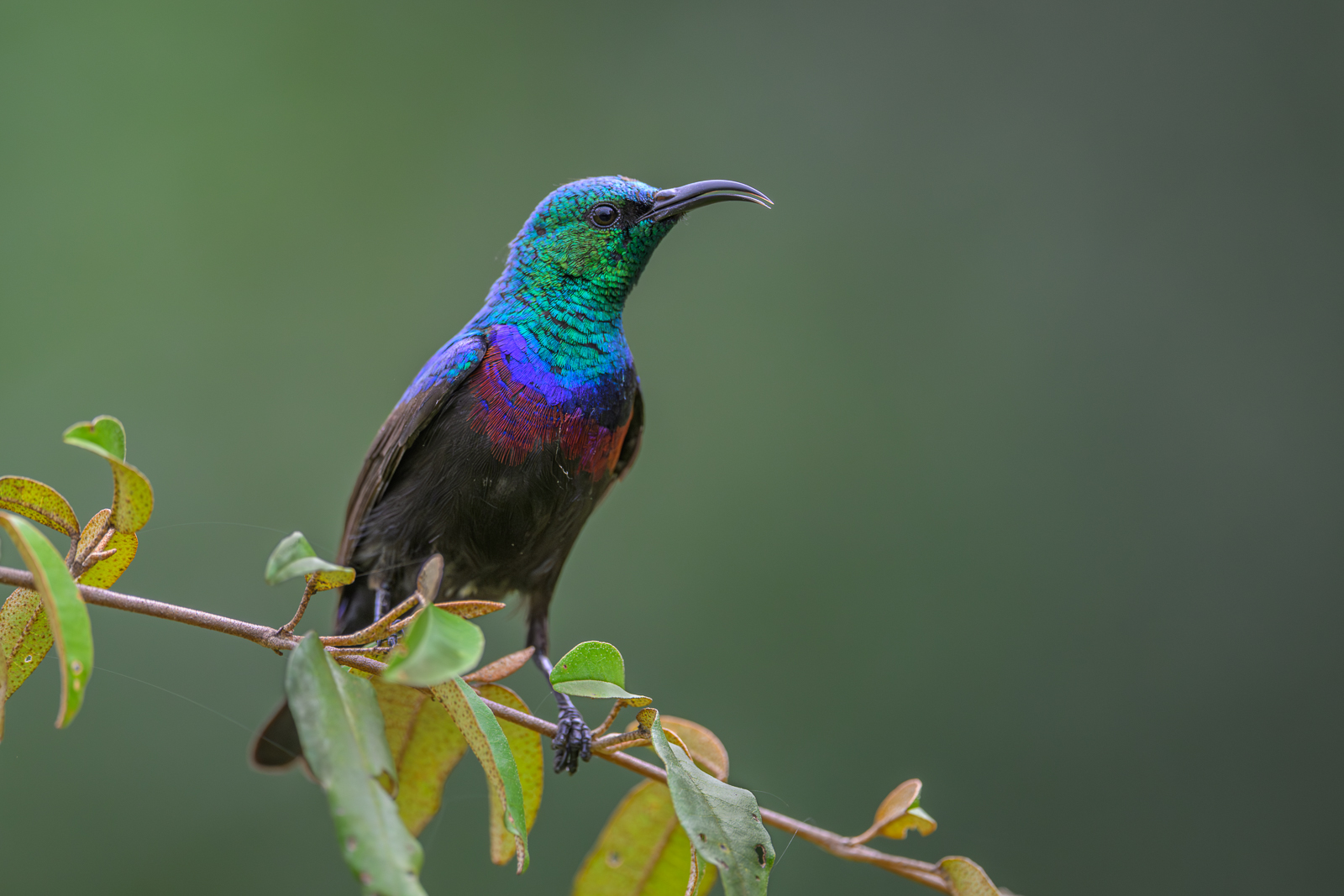 This beauty is a red-chested sunbird, captured during one of my favorite times of day while on safari — in between game drives when I get to walk around camp while most everyone else is taking their afternoon siestas. It’s a small bird found in parts of East and Central Africa. Males, like this one, have an iridescent green head, scarlet chest, and metallic blue highlights. Using a slender, curved bill, it feeds on nectar from flowers, often hovering like a tiny hummingbird, though it will also perch to feed. Nikon Z8 with Nikkor 500mm PF lens, ISO 1800, f/5.6 at 1/2000th of a second.