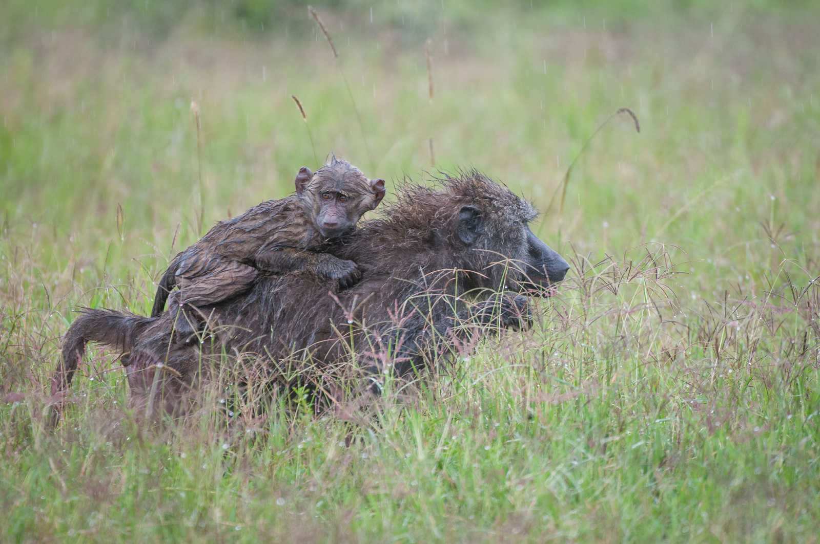 Interesting fact about the bat-eared fox — the males are the primary care givers to the young, unlike most other canines. The mothers will lactate for about 15 weeks, after which the males take over grooming, defending, huddling, chaperoning, and carrying the young between den sites. I photographed this bat-eared fox in the Masai Mara of Kenya on a rainy afternoon.