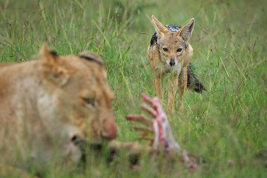 About a year ago I posted a similar shot, but from the lion’s point of view. This one shows the concentration — and frustration — on the face of this black-backed jackal. The lion, in fact, seemed to be toying with the jackal and refusing to let it get any satisfaction. She had virtually stripped the carcass clean but still wouldn’t abandon it. The jackal finally gave up and left. Just as soon as it was out of sight, the lion got up and walked away herself.