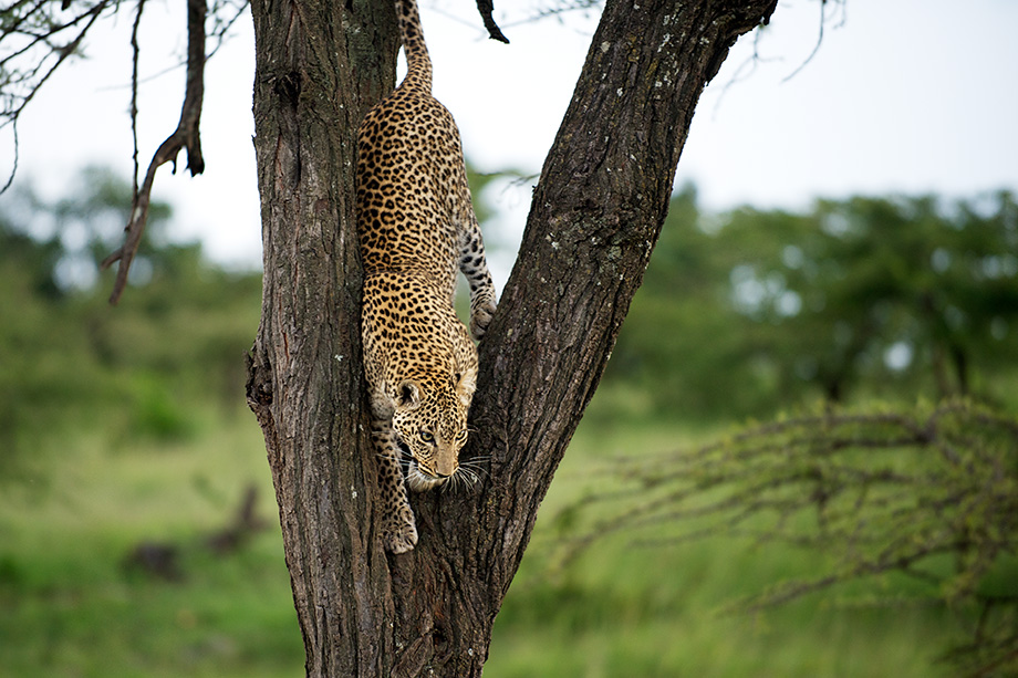 Leopards are one of the few big cats that have the ability to climb down trees head first. This young lady was heading back out on the prowl after feasting on an impala that she had dragged up into the tree earlier in the day. By keeping their kills on a high branch, leopards are able to avoid run ins with non-climbing scavengers like hyenas.