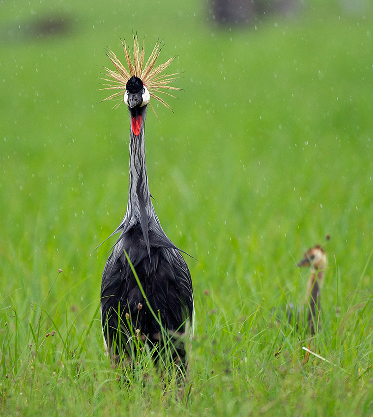 This crested crane had about five chicks, but they were all scattered about in the grass. At least you can see one, blurred out in the background. It was raining pretty hard, but it also happened to be a great day for shooting. The location was Laikipia, Kenya.