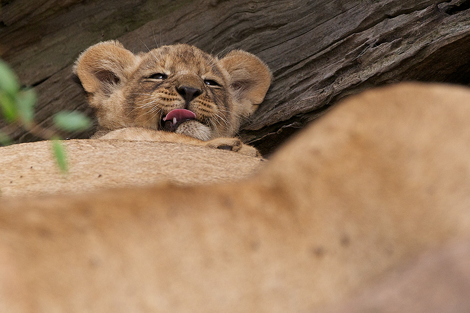 This poor little lion cub got pinned against that log when its mother rolled over in her sleep. After a quick struggle, the little guy was able to get free and climb on top of mom to continue playing.