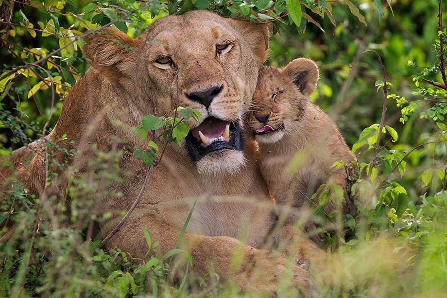 In honor of my mother, whose birthday it is today, I had to go with a mother/baby shot. These two lions were temporarily separated from the rest of the pride — the mom guarding a wildebeest kill she had just made. The baby kept nuzzling up to the mom, but every now and again — probably bored because there was no one else to play with — would come out of the bushes to investigate us. Happy Birthday Mom.