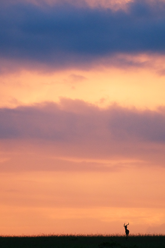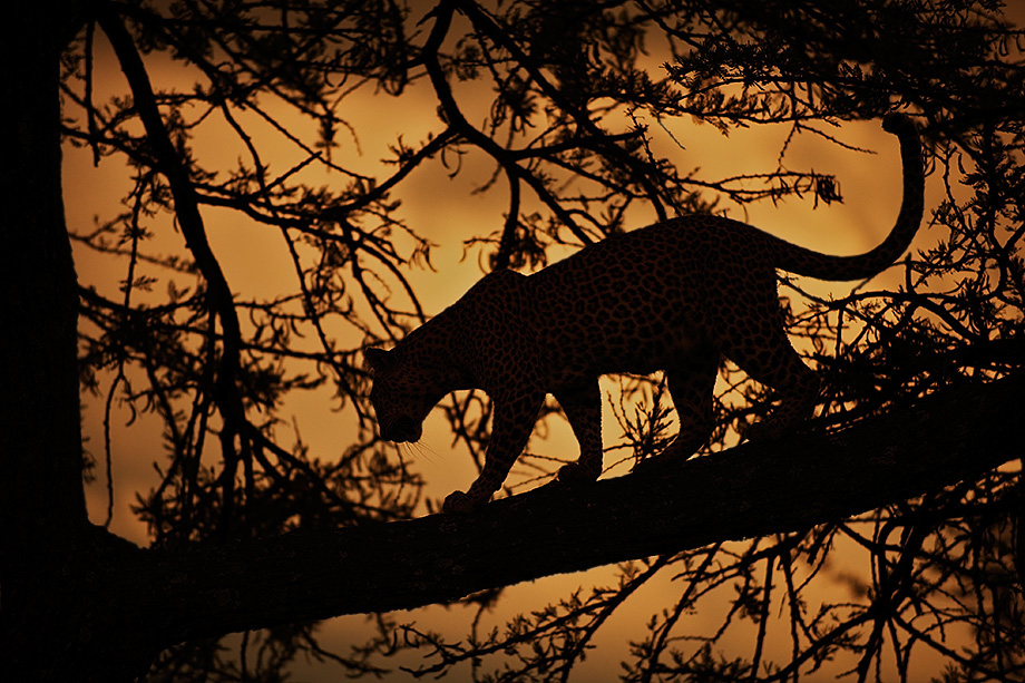 Earlier on this particular day we had spotted an impala carcass hanging from a tree — a sure sign that a leopard was in the area. We couldn’t locate the leopard but knew that eventually she would come back to claim her meal. We returned a couple of hours later and there she was, enjoying a little lunch up in the tree. We checked back in one more time at the end of the day and saw her again. She was still on the kill, but eventually got up and walked down the tree, allowing me to take this silhouette shot.