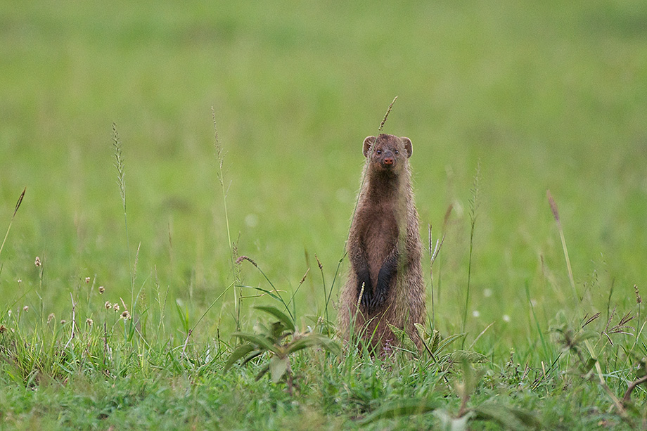 This is a banded mongoose, photographed in the Masai Mara of Kenya. Unlike other mongoose species that live solitary lives, the banded mongoose lives in colonies. This particular mongoose and the rest of its colony lived in a network of burrows that was right next to a bat eared fox den. The banded mongoose will also live in close proximity to baboons and warthogs — foraging and actually being handled by the former, and picking ticks from the latter.