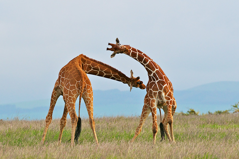 When giraffes fight, they use their long necks to try and punish their opponents. The behavior is called necking and we only saw it once when we were in Kenya. These two males were really going at it, slapping each other with their heads, both landing blows here and there, but neither really delivering a knock out punch. Eventually they grew tired of whatever it was that they were fighting about and they resumed foraging.